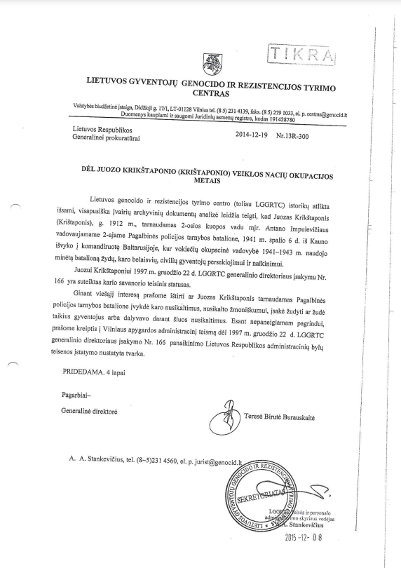 Seimo sudaryta desovietizacijos komisija pateikė rekomendacijas Lietuvos gyventojų genocido ir rezistencijos tyrimo centrui (LGGRTC) nukelti partizanui Juozui Krikštaponiui skirtą paminklą Ukmergėje. Deja, LGGRTC, vietoje to, kad imtųsi konkrečių veiksmų ir pašalintų paminklą už tūkstančių nekaltų žydų žudynes atsakingam asmeniui, kreipėsi į Generalinę prokuratūrą su prašymu panaikinti partizanui suteiktą statusą. Tai – akivaizdus delsimas ir atsakomybės permetimas kitai organizacijai.