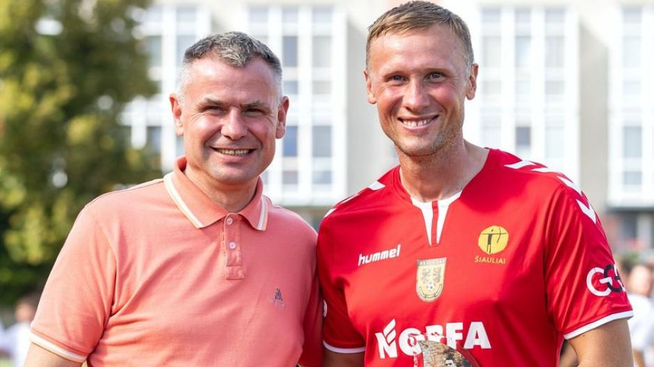 Rezultatyviausias turnyro žaidėjas Vilius Lapeikis (dešinėje) ir Šiaulių apskrities futbolo federacijos prezidentas Gintautas Mirauskas / Evaldo Černiausko / ŠAFF nuotr.