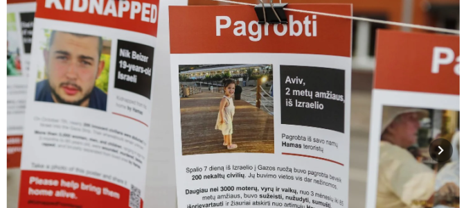 Vakar Šiauliuose Višinskio gatvėje ties 24 numeriu pažymėtu pastatu buvo iškabintos spalio 7–ąją „Hamas” teroristų pagrobtų įkaitų nuotraukos – vaikų, moterų, vyrų, senolių ir neįgaliųjų. Taip jautriai Šiaulių apskrities žydų bendruomenė siekė atkreipti visuomenės dėmesį į jau daugiau nei mėnesį barbarų nelaisvėje atsidūrusių žmonių likimą.