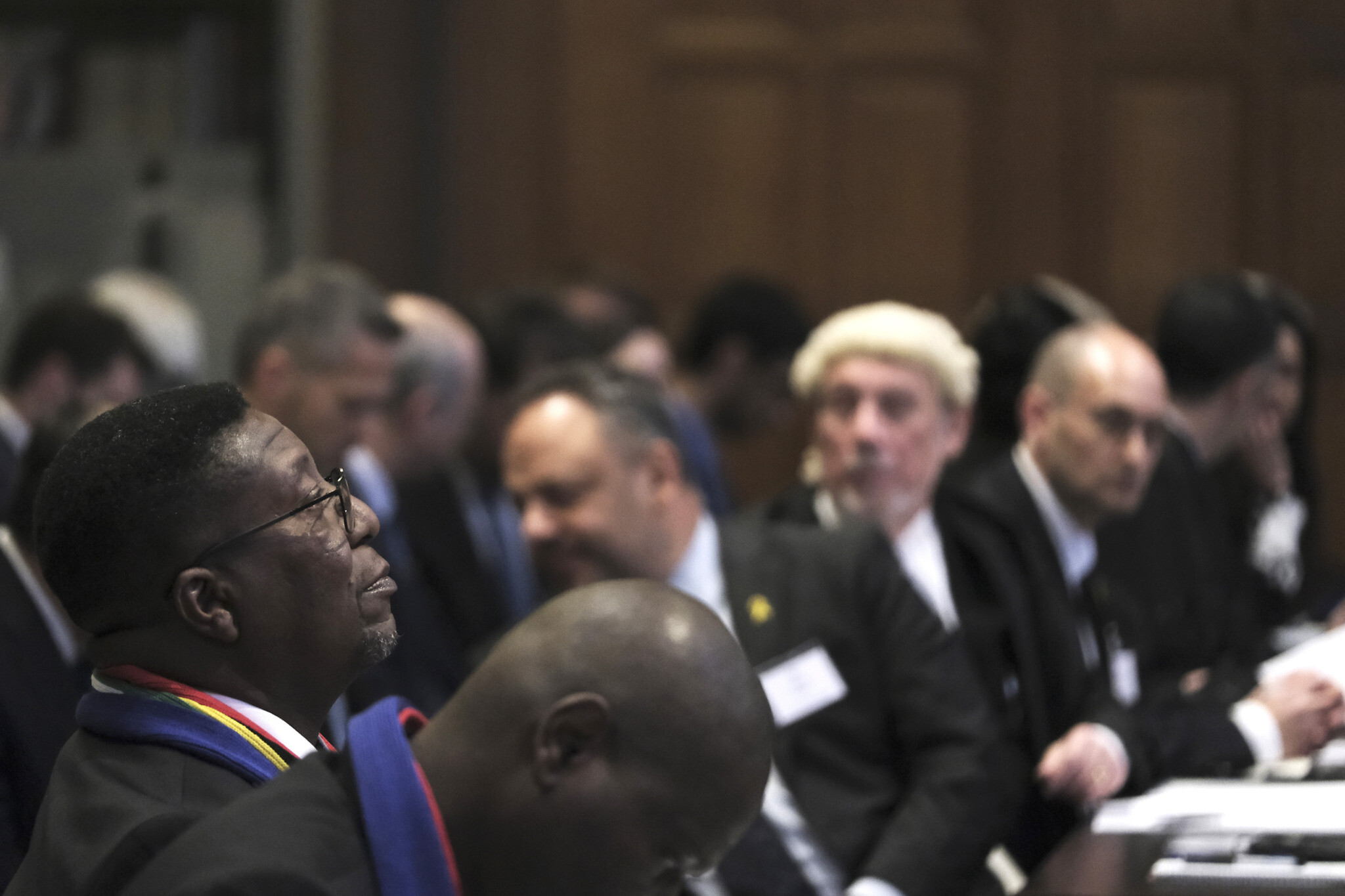 Pietų Afrikos Respublikos ambasadorius Nyderlanduose Vusimuzi Madonsela ( kairėje), laukia posėdžio pradžios. Fone – Izraelio atstovai / AP / Patricko Posto nuotr.