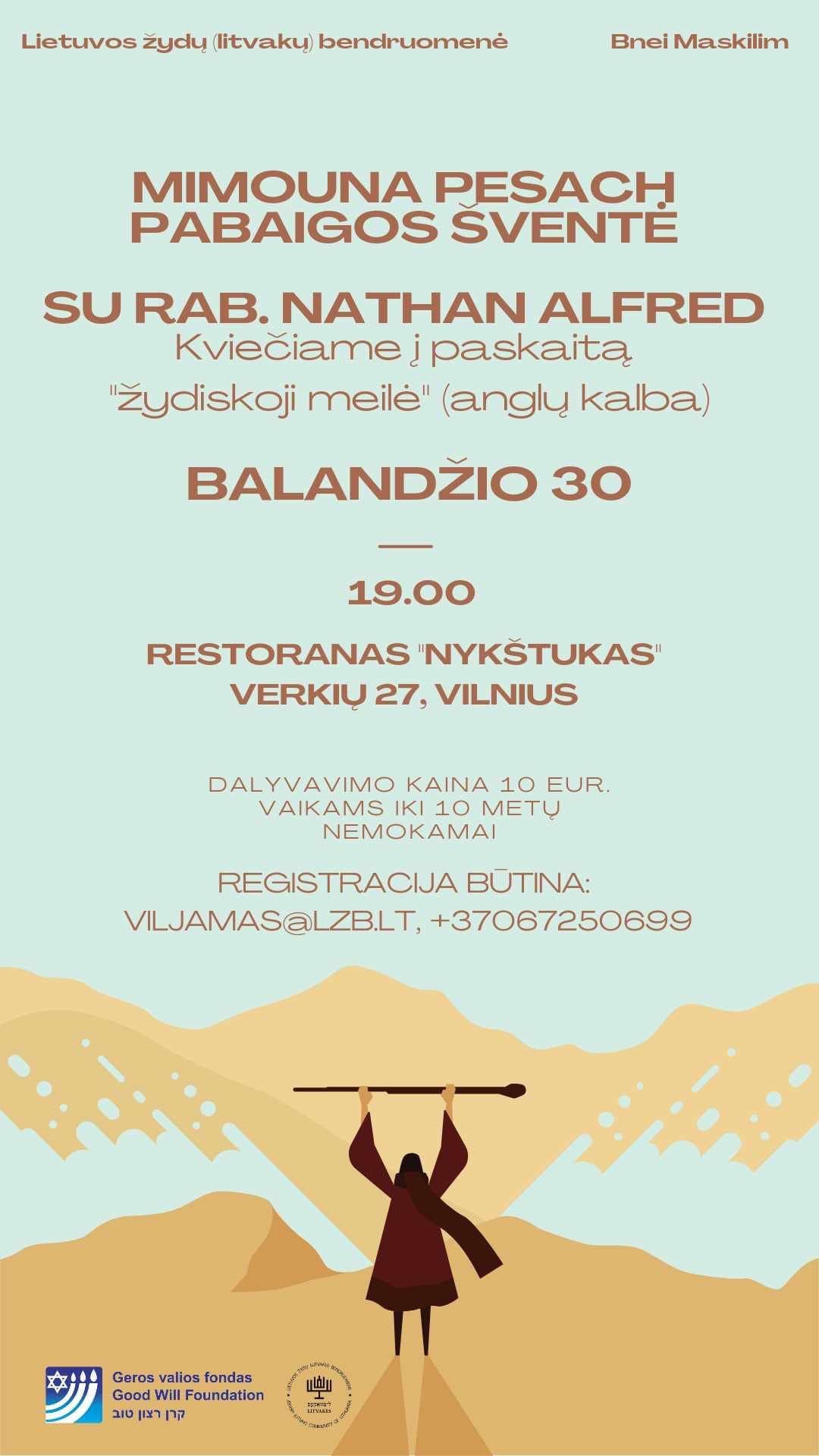 Mimouna Pesach – bene svarbiausios žydų metų savaitės pabaigos šventė, į kurią specialiai atvyksta mūsų bendruomenei jau puikiai pažįstamas ir ypač jaunosios kartos mylimas puikus rabinas Nathanas Alfredas. Jis, be apeigų, skaitys ir paskaitą anglų kalba „Žydiškoji meilė“.