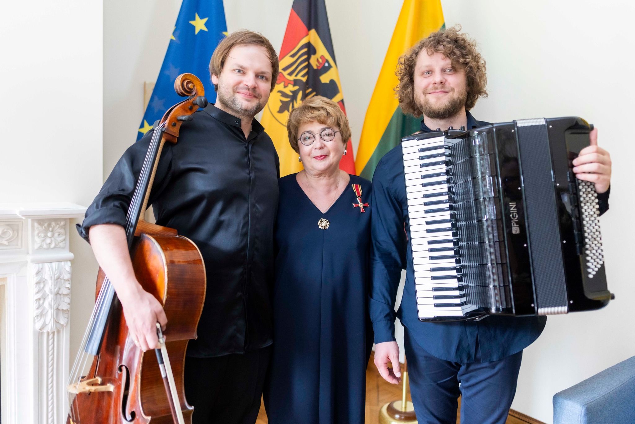Faina Kukliansky su violončelininku Glebu Pyšniaku ir akordeonininku Tadu Motiečiumi / Vokietijos ambasados Lietuvoje / Irmanto Gelūno nuotr.