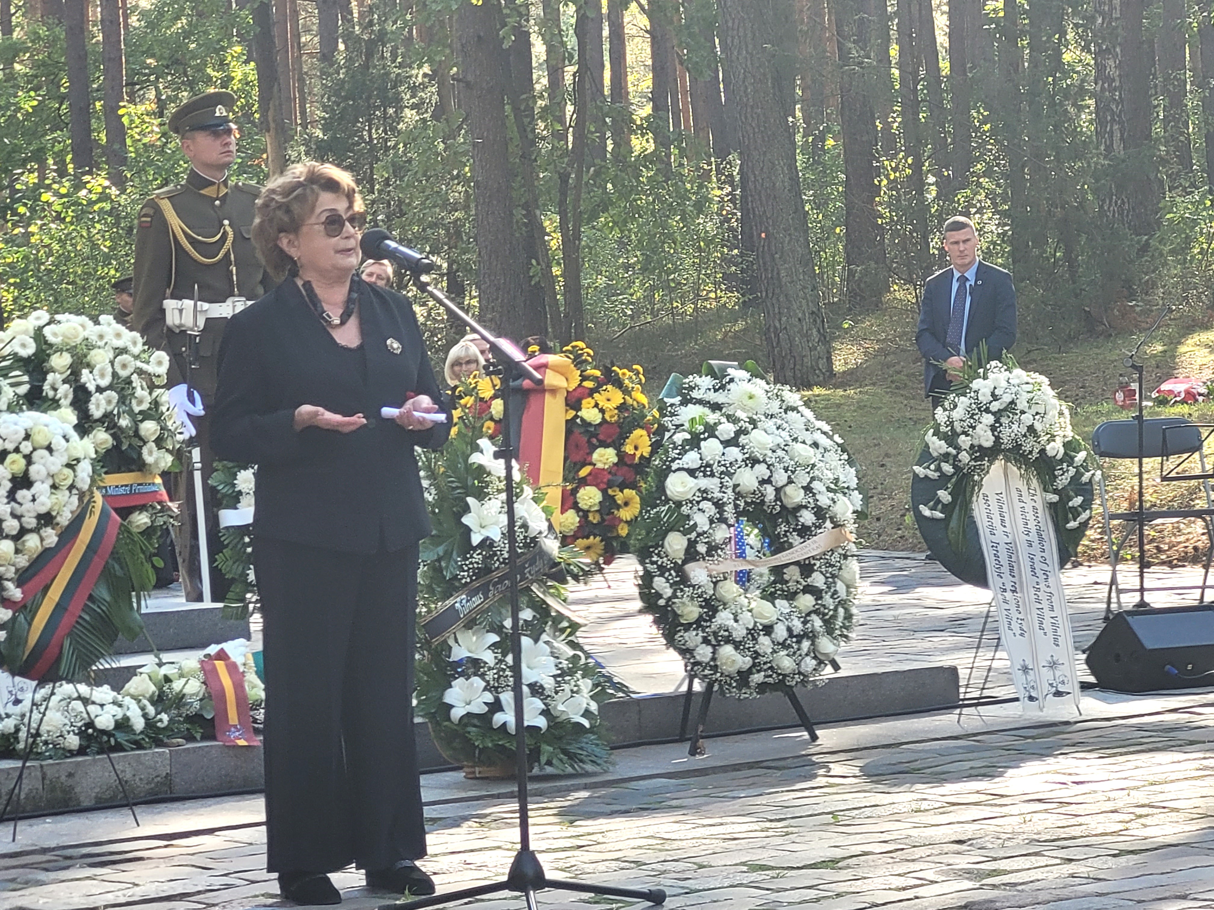 „Šiandien stovime Panerių memoriale, vietoje, kuri byloja mūsų tautos skaudžiausią istoriją. Čia buvo nužudyti tūkstančiai nekaltų žmonių, kurie troško gyventi taikioje ir saugioje visuomenėje, kurie buvo Lietuvos dalis ir, ją atėmus, nuskurdo ne tik mūsų valstybė, bet ir visas pasaulis. Jie buvo beprasmiškai nužudyti dėl savo kilmės ir tikėjimo. Jų balsai mus pasiekia iš praeities kaip liudininkų pasakojimai, kurie šiandien mums visiems yra ne šiaip istorijos pamokos, bet perspėjimas“, – sakė Ministrė Pirmininkė.