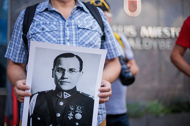 Piketas dėl nukabintos lentos Kaziui Škirpai / E. Blažio / LRT nuotr.