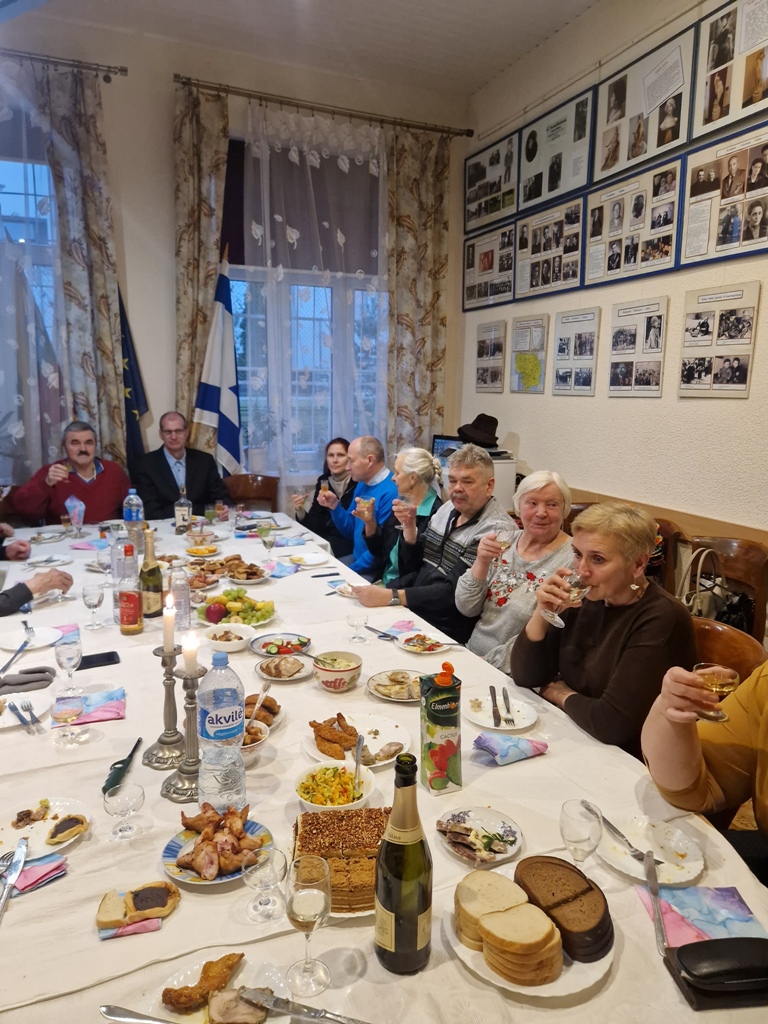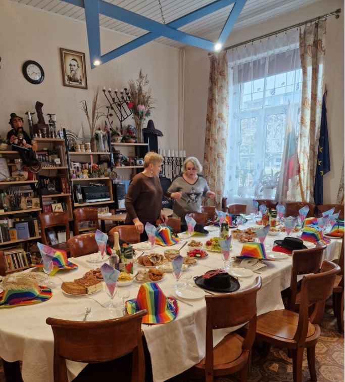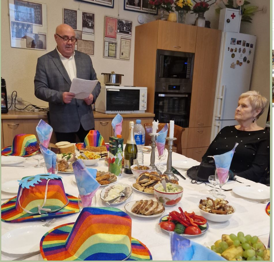 Panevėžio m. žydų bendruomenės nariai, pasipuošę kaukėmis ir džiaugsmingai nusiteikę, bendruomenės patalpose prie vaišėmis nukrauto stalo susirinko švesti Purimo šventę.