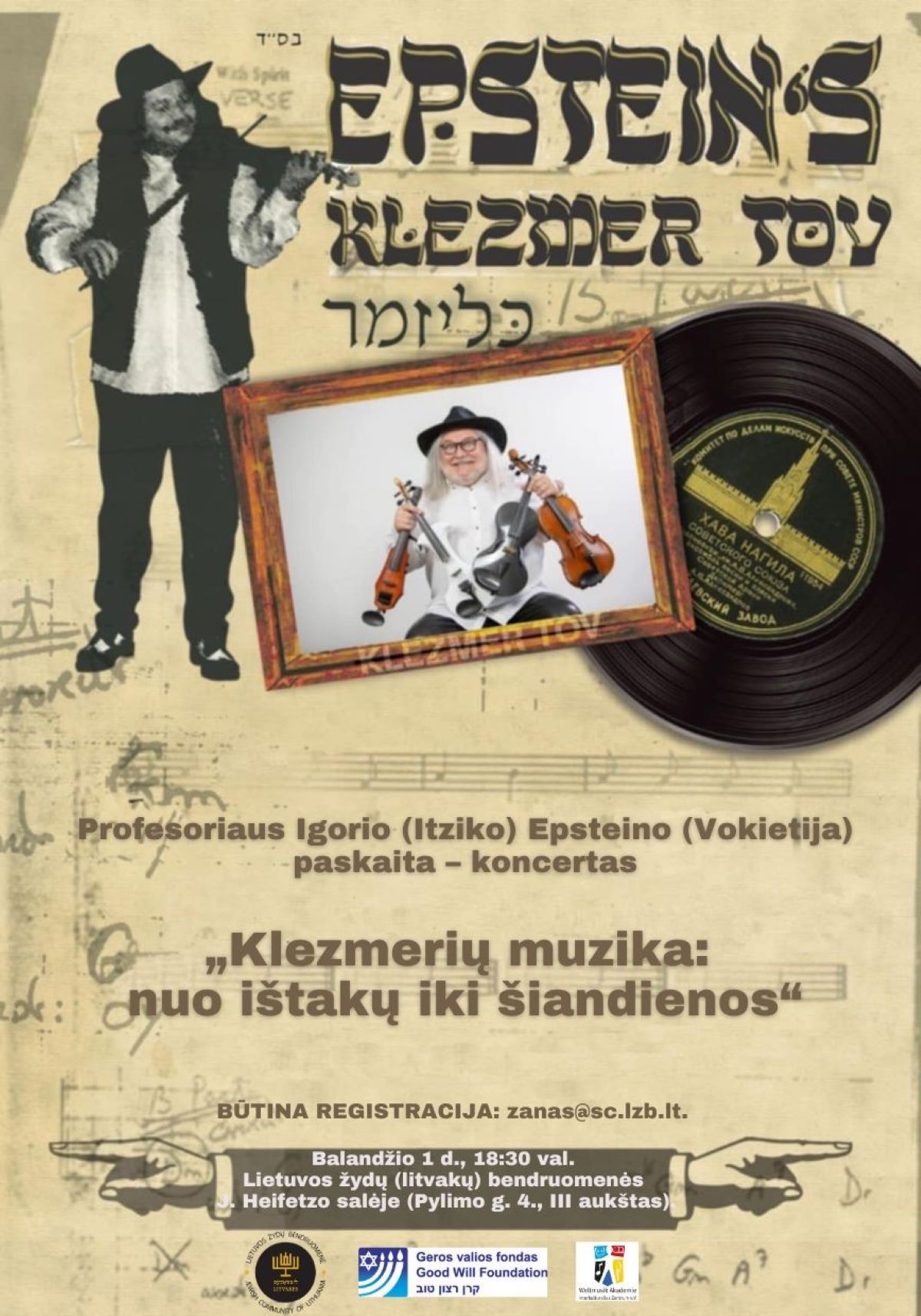 Lietuvos žydų (litvakų) bendruomenė kviečia į paskaitą – koncertą „Klezmerių muzika: nuo ištakų iki šiandienos“. Renginį veda Vokietijoje gyvenantis profesorius Igoris (Itzikas) Epsteinas.