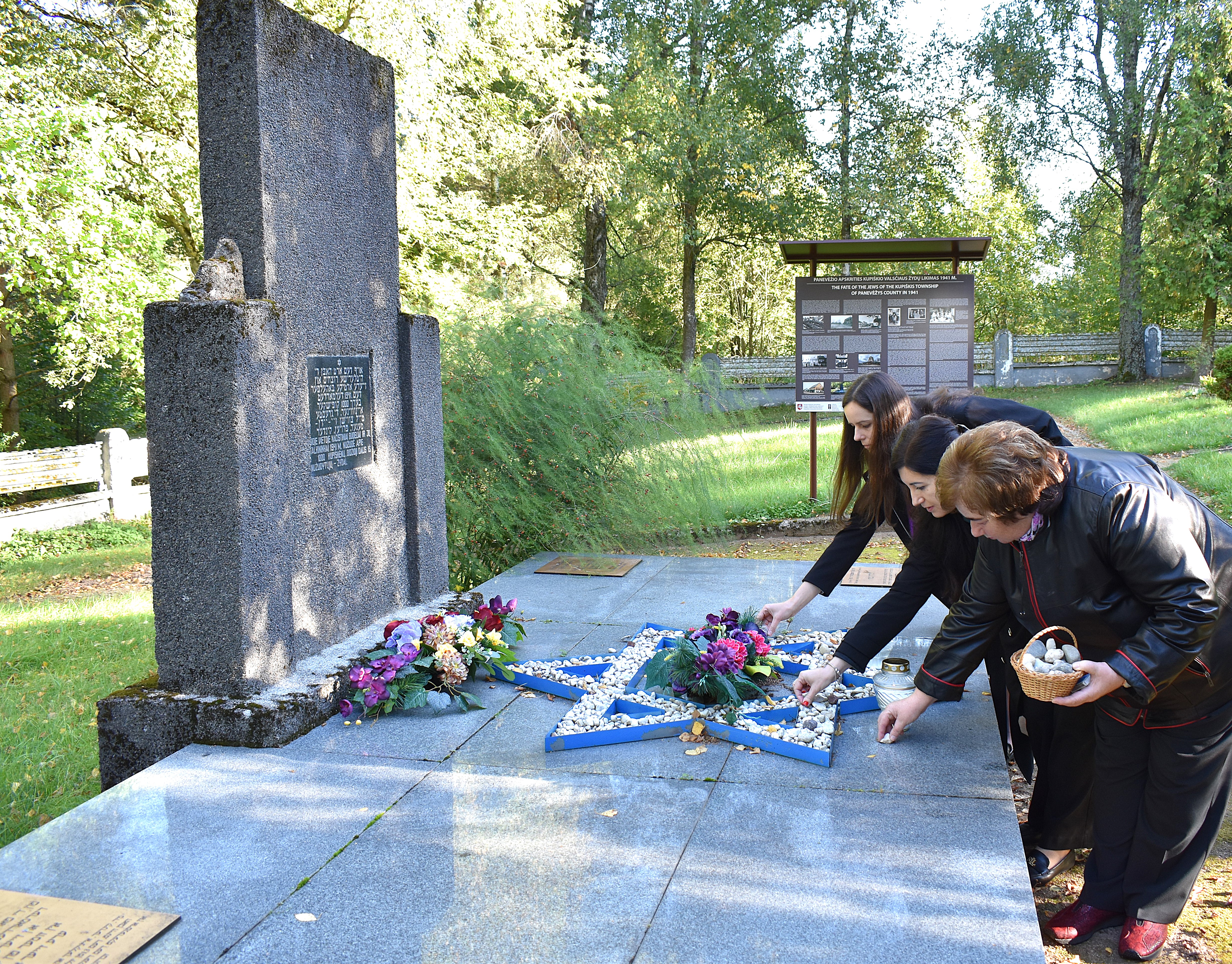 Pagerbiant Holokausto aukų atminimą, prie paminklo Kupiškio laisvamanių kapinėse dedami akmenukai. Iš dešinės: Kupiškio muziejaus muziejininkė Aušra Jonušytė, Kupiškio rajono savivaldybės mero patarėja Auksė Čepelė ir Kupiškio muziejaus muziejininkė Miglė Zakarauskaitė.