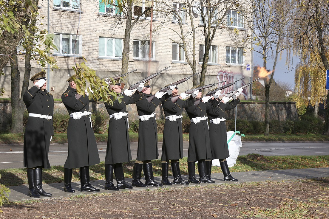 Ant paminklo padėtas simbolinis gėlės žiedas, uždegta žvakė, tris atminimo ir pagarbos salves iššovė Garbės sargybos kuopos kariai. Artūro STAPONKAUS nuotr.