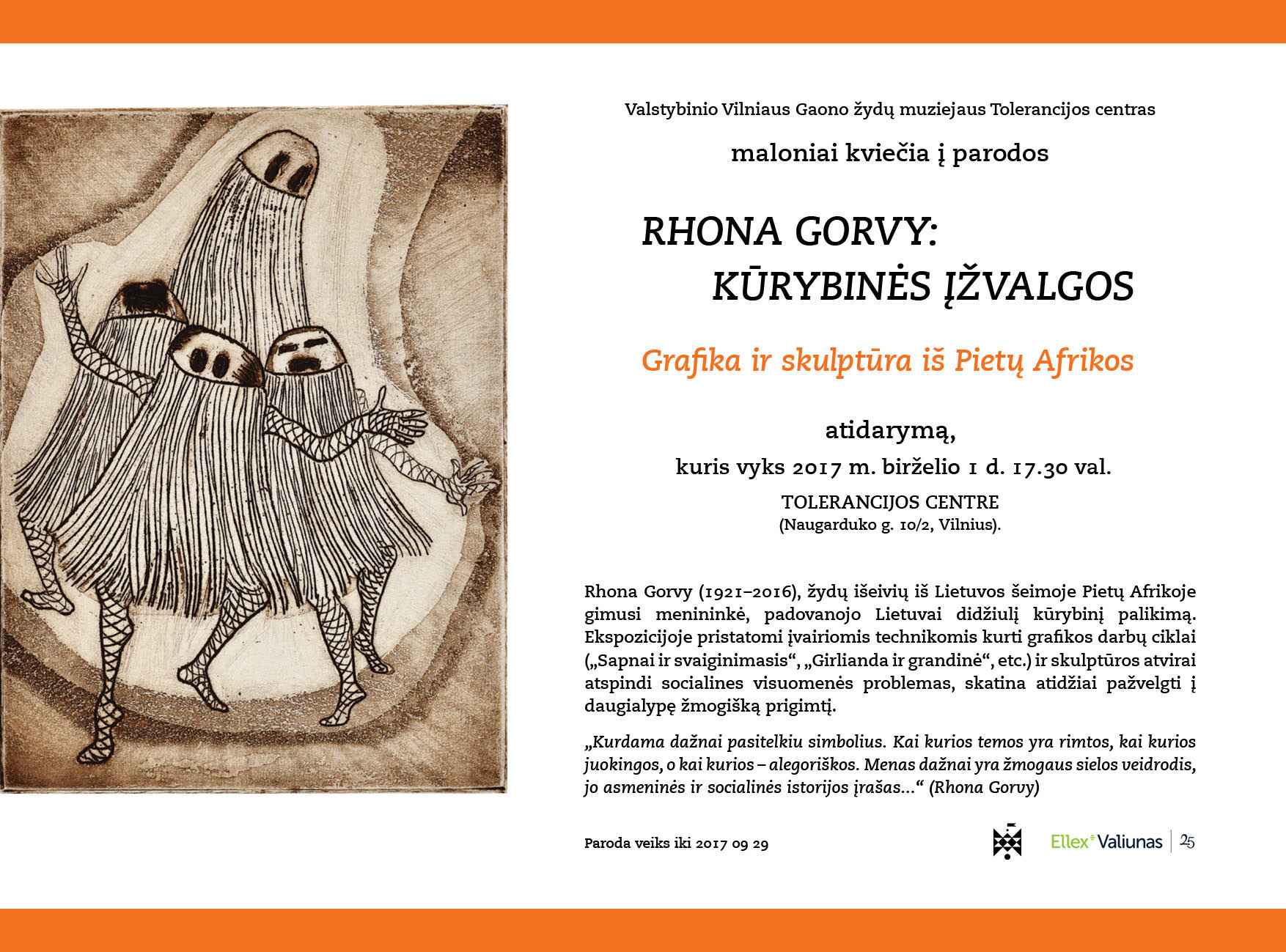 Pirmąją vasaros dieną, birželio 1 d. 17.30 val., Valstybinio Vilniaus Gaono žydų muziejaus Tolerancijos centre (Naugarduko g. 10/2, Vilnius) bus atidaryta paroda „Rhona Gorvy: kūrybinės įžvalgos“. Rhona Gorvy – menininkė, gimusi žydų išeivių iš Lietuvos šeimoje Pietų Afrikoje – Lietuvai padovanojo didžiulį kūrybinį palikimą. Parodoje eksponuojami jos grafikos darbų ciklai ir skulptūros atspindi socialines žmonijos problemas, kelia visuomenei aktualius klausimus, skatina atidžiai pažvelgti į įvairiapusę žmogiškąją prigimtį.