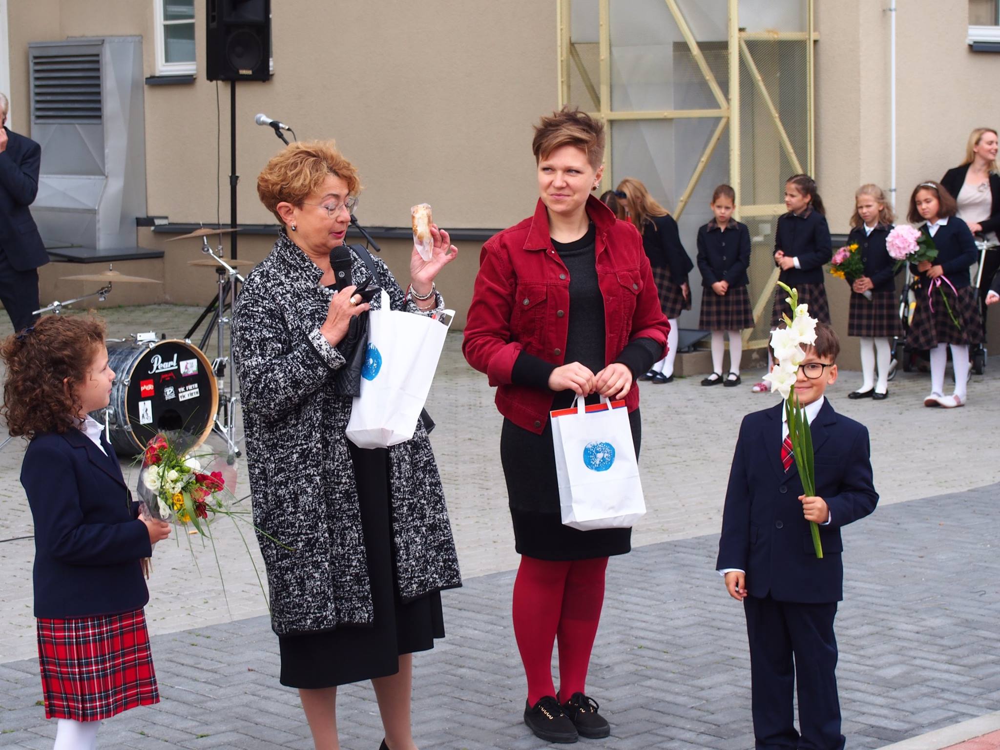 LŽB pirmininkė sveikina pirmokus, linki  gerai mokytis, o kad jie neišalktų, įteikia “Beigelių krautuvėlės” košerinius beigelius. Daugiau nuotraukų kitame puslapyje.