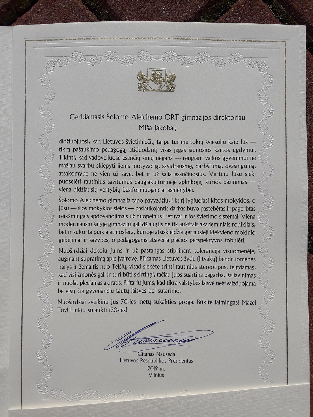 Miša Jakobas, Vilniaus Šolomo Aleichemo ORT gimnazijos direktorius sveikina su Rugsėjo 1-aja