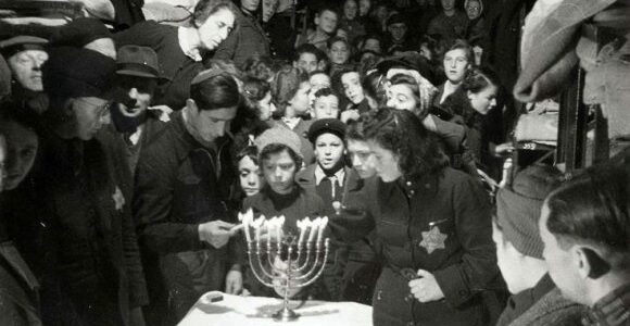 Belaisviai dega Chanukos žvakes tranzitinėje koncentracijos stovykloje; Yad Vashem nuotr.
