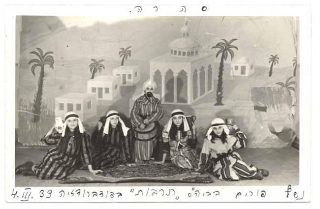 Tarbut gimnazijos mokiniai Pabradėje pasiruošę Purim vaidinimui, 1939 m. kovo 3 d. YIVO Institute for Jewish Research archyvo nuotrauka.