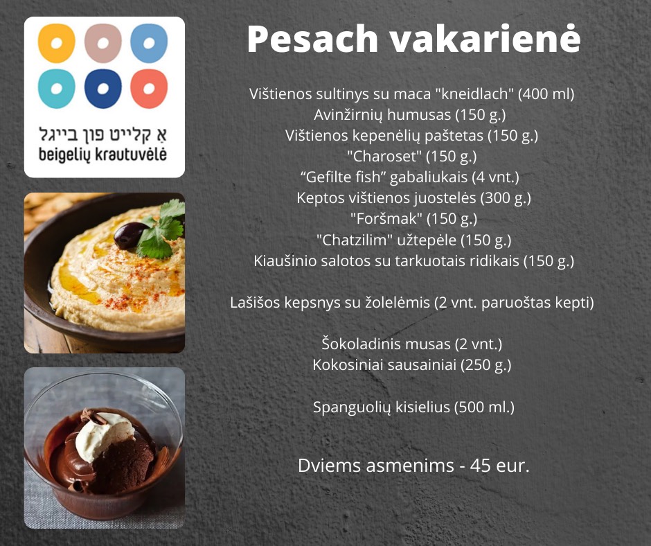 Be to, pirmąją šventinę dieną visų Šiaulių krašto žydų bendruomenės narių stalus pasiekė šventinės Pesach vakarienės rinkiniai su tradiciniais žydiškais patiekalais: kapota silke (foršmaku), vištienos kepenėlių paštetu, vištienos vyniotiniu, vištienos sultiniu su macos kukuliais (maca kneidlach) bei imberlach. Už tai esame dėkingi restoranui „Žemaitis“ ir Geros valios fondui. Tad nors pandemija ir pakeitė mūsų tradiciją susėsti prie vieno bendro šventinio stalo, stengiamės išlaikyti šventinę dvasią Šiaulių krašto žydų bendruomenėje ir bent jau mintimis pabūti kartu prie bendro stalo.