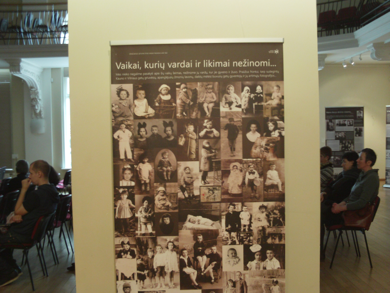 During her presentation, Selčinskaja mentioned a number of people related to people still alive and still working at both the Vilna Gaon Museum and at the Lithuanian Jewish Community. She listed the names in a private email to me after the event, and for every living person, the names of their relatives, including parents and siblings, murdered during the Holocaust in Lithuania were from four to ten times more numerous. Some of the living relatives figure in the panels, some do not because they escaped the Holocaust outside of Lithuania, but their brothers, sisters, cousins, aunts and uncles are included in the exhibit. There were survivors at the presentation that day, including Tobias Jafetas, who spoke from the podium, and Fruma Kučinskienė of Kaunas, the rescued child who was the main figure in the documentary film “Etude of Hope” released in 2007.
