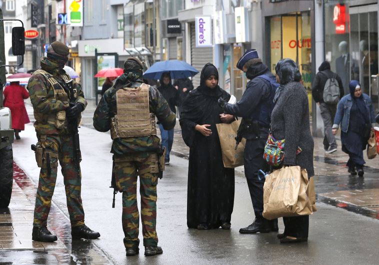 Belgian soldiers and a police officer control the documents of a woman in a shopping street in central Brussels, November 21, 2015. (photo credit: REUTERS)