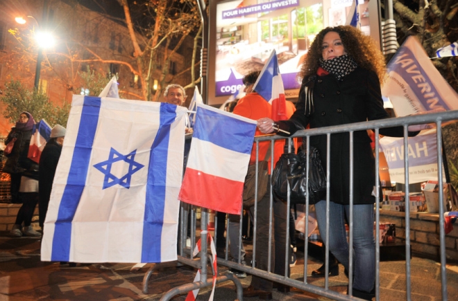 Members of France’s Jewish community wave Israeli and French flags at a ceremony outside the Hyper Cacher supermarket in Paris a year after four Jewish shoppers were killed in a terror attack at the store on January 9, 2015. (photo: Flash 90/Serge Attal)