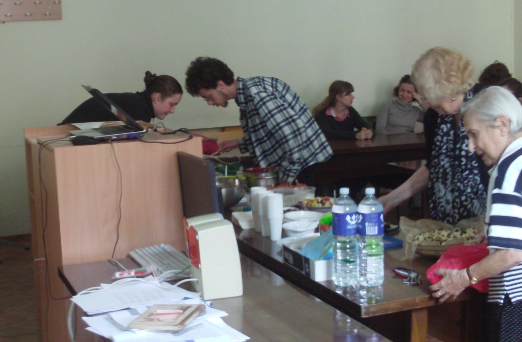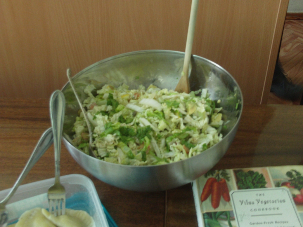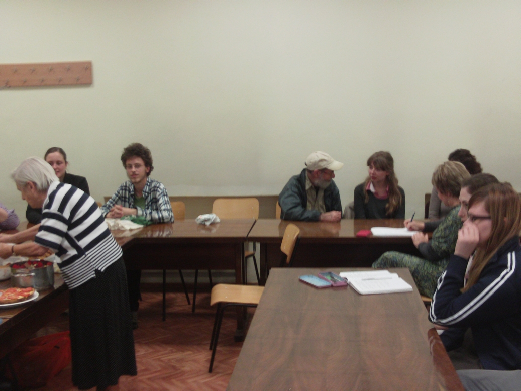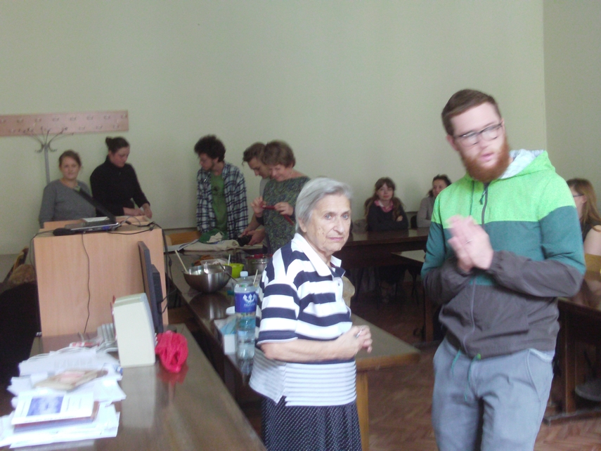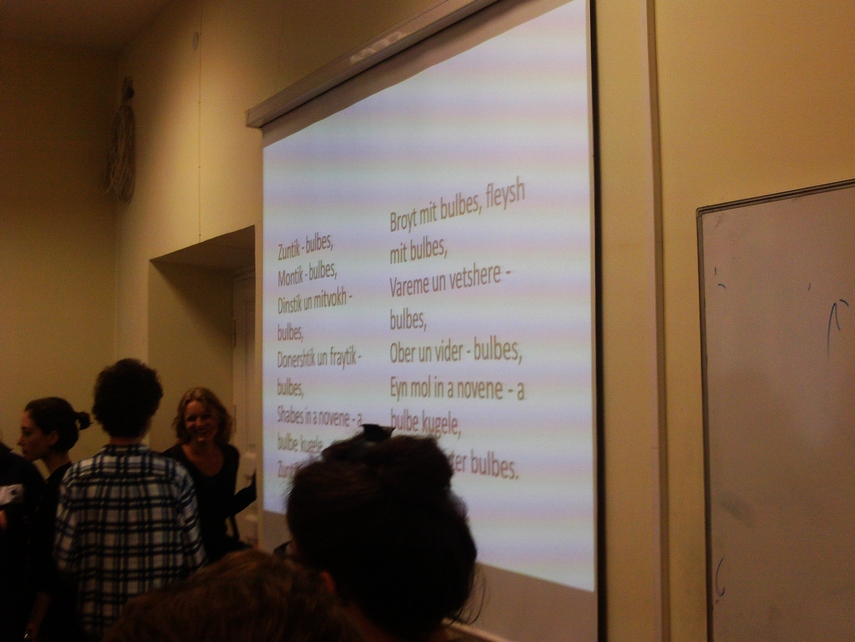 As a local Lithuanian man took photographs and filmed from various vantage points in the room, the students who had made food for the potluck each took turns trying to describe their dish in Yiddish. A sort of comedy of errors ensued as the two native speakers of Yiddish in the room attempted to make sense of “melon-latkes” and similar novel concoctions. VYI coordinator Indre Joffyte’s offering was almost instantly translated from “cauliflower” to “blumenkroyt,” and the spicy steamed cauliflower heads in a tangy, almost Indian sauce (or was it pickled cauliflower in a curry sauce?) later turned out to be the tastiest item by far at the table that afternoon.