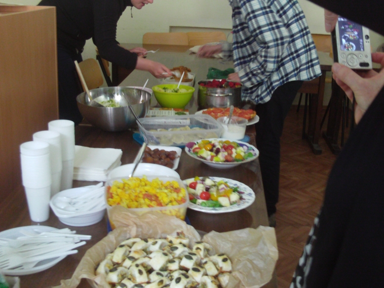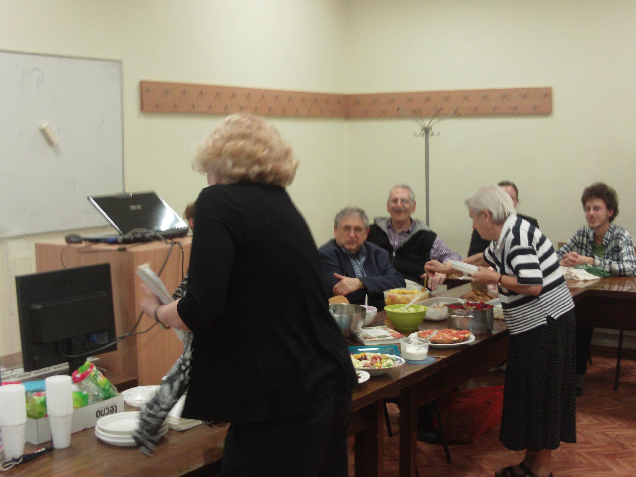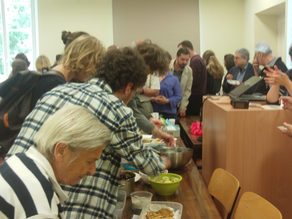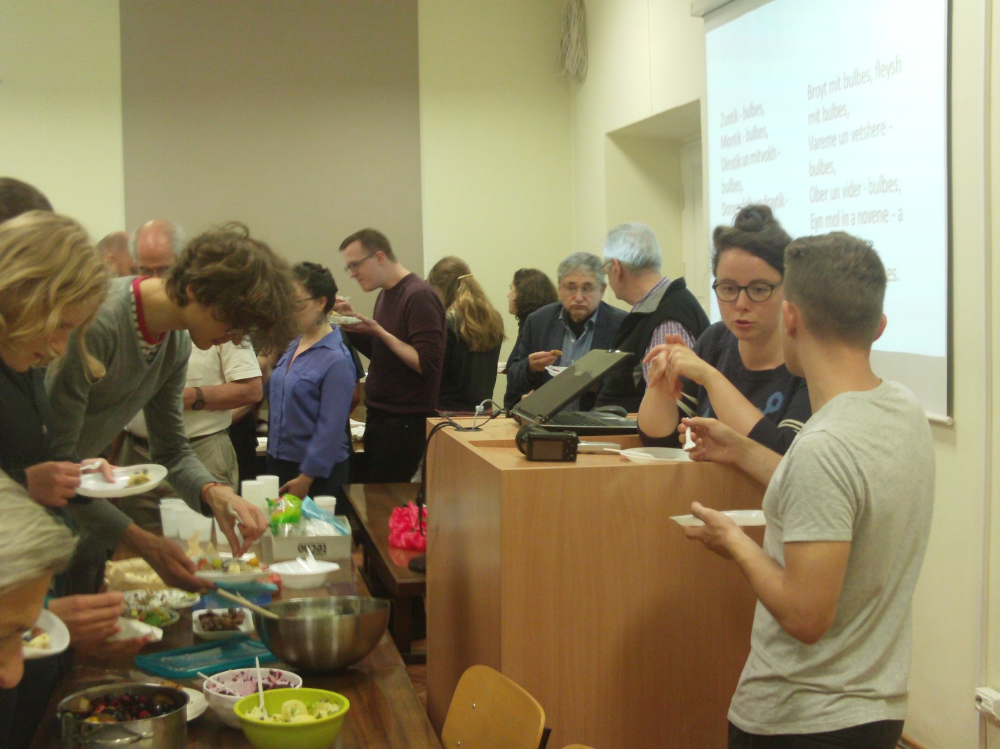 Slowly the comedy of errors became a sort of game of charades and then a game show, and a fun learning experience. After the dishes were introduced everyone lined up at the table and piled heaps of kashe, latkes, pumpkin-seed pastry and quiche onto plastic plates and ate mainly standing up in small groups around the classroom. Many went back for second and third helpings, and by the time professor Dov-Ber Kerler arrived there was only salad left, which he declined, saying he had already had lunch.