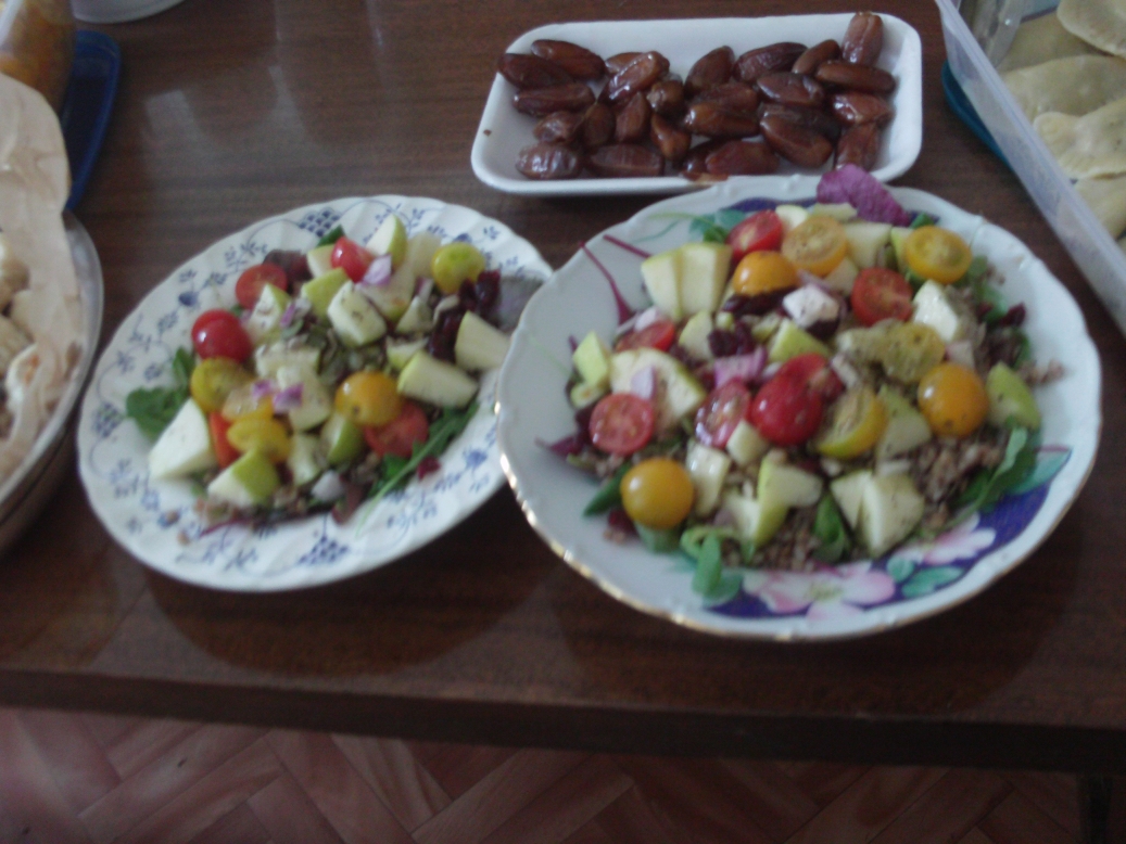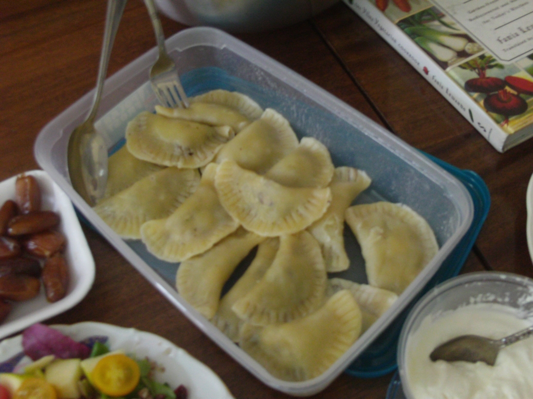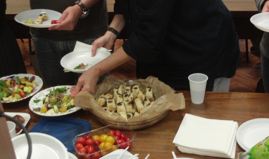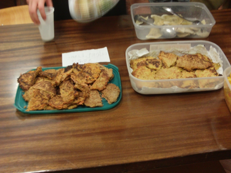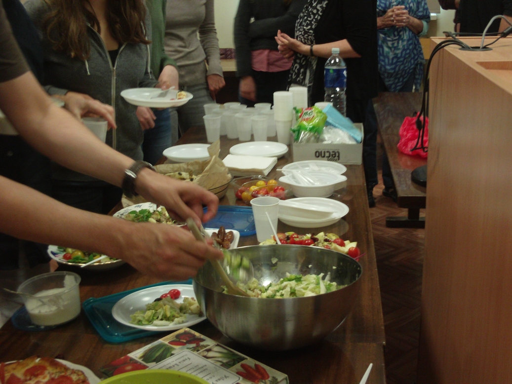 Slowly the comedy of errors became a sort of game of charades and then a game show, and a fun learning experience. After the dishes were introduced everyone lined up at the table and piled heaps of kashe, latkes, pumpkin-seed pastry and quiche onto plastic plates and ate mainly standing up in small groups around the classroom. Many went back for second and third helpings, and by the time professor Dov-Ber Kerler arrived there was only salad left, which he declined, saying he had already had lunch.