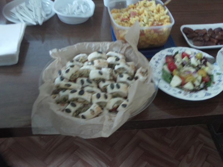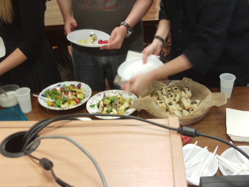A full classroom of perhaps 30 people listened intently as latecomers filtered in, some bearing plates and bowls of food. A long table in front of the podium enticed the eye with a variety of dishes made by the students and staff themselves.
