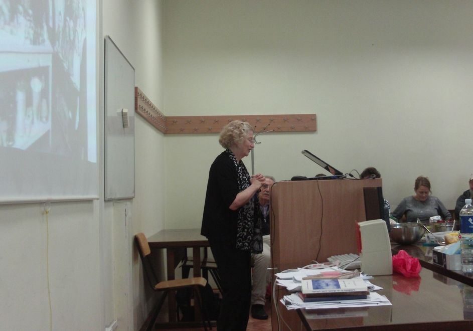 Cassedy gave a brief presentation in Yiddish about the remarkable prewar vegetarian cookbook by Fania Lewando and spoke about her life and her vegetarian restaurant which was located on what is now Vokiečių street in Vilnius. Using slides Cassedy showed period photographs and pictures of foods featured at the restaurant, occasionally clarifying her remarks in English.