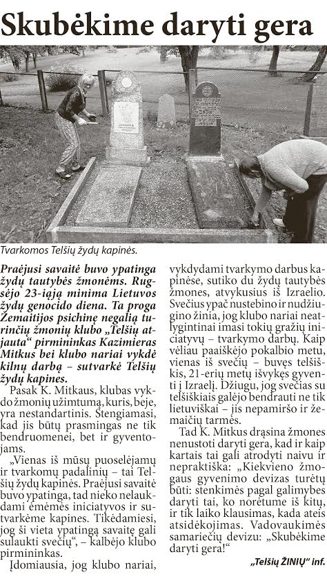 Last week was special for Jews. On September 23 the Day of Genocide of Lithuanian Jews was marked. To mark the day, a club of mentally disabled people in Žemaitija called Telšių Atjauta [Empathy of Telšiai] under their chairman Kazimieras Mitkus did a good deed: they cleaned up the Jewish cemetery in Telšiai.