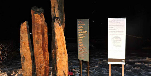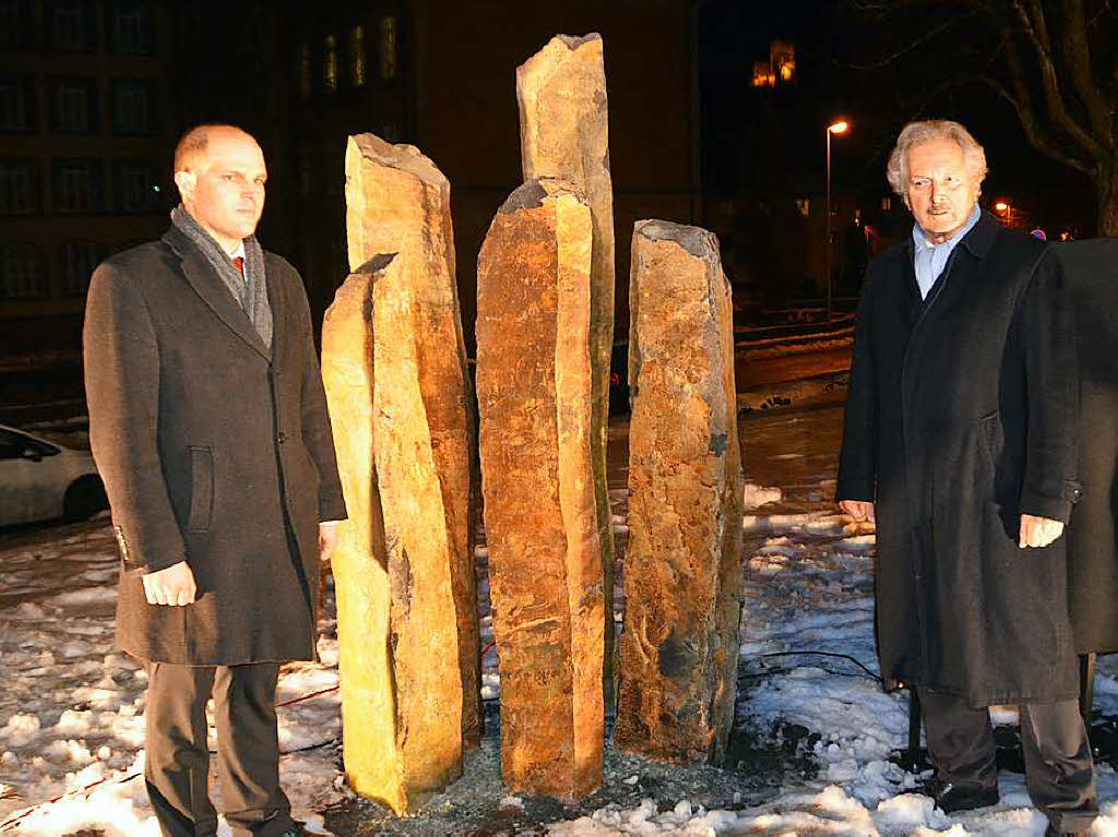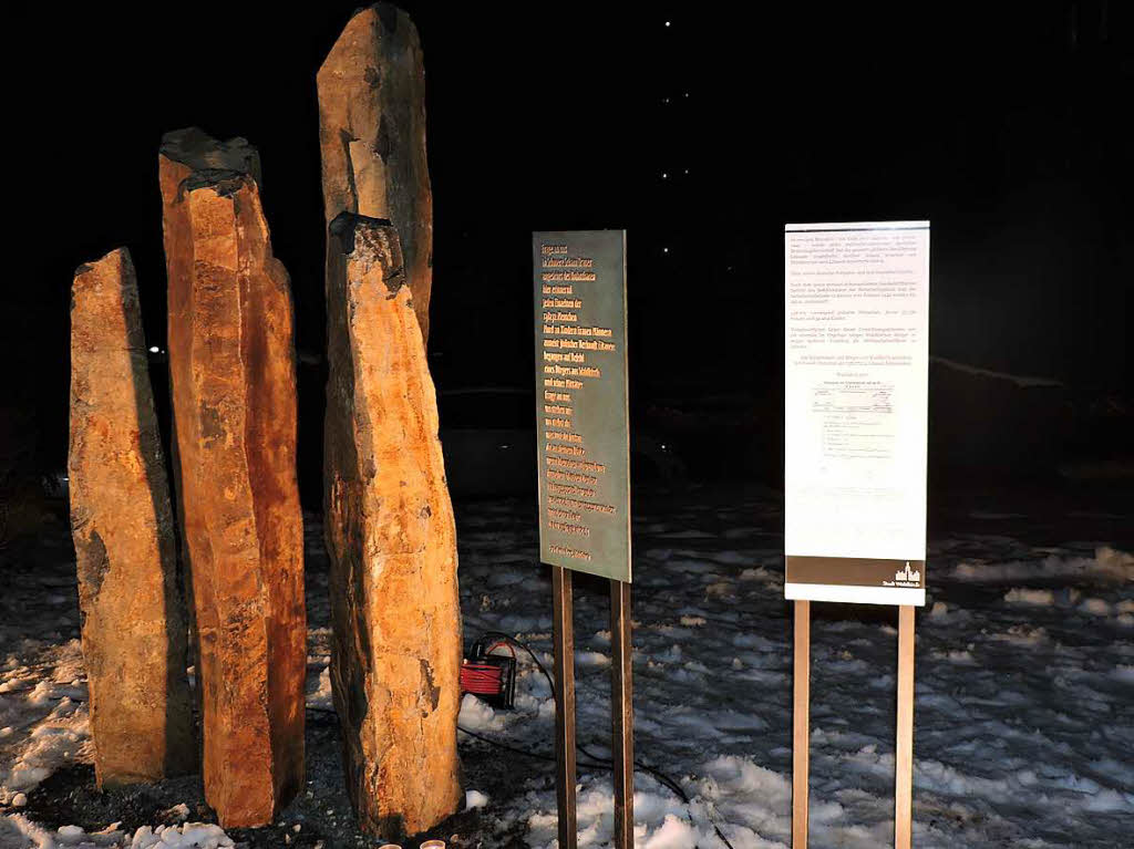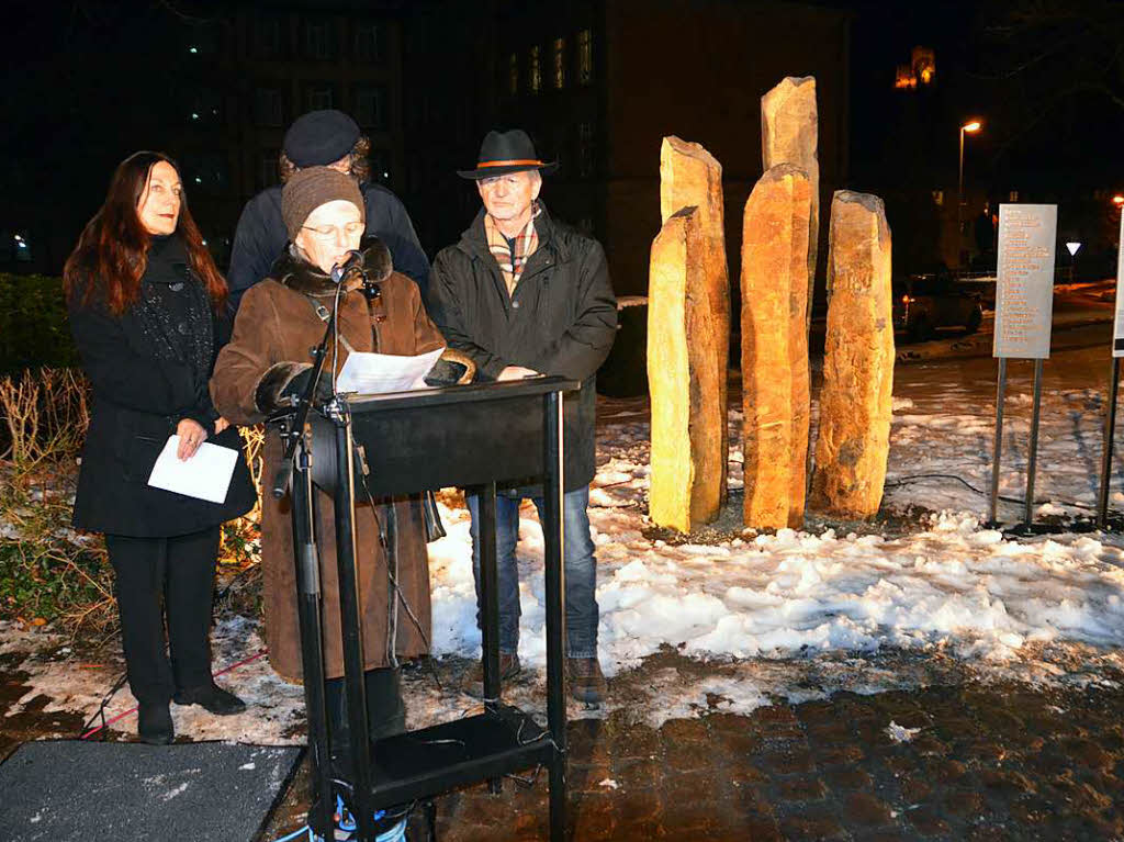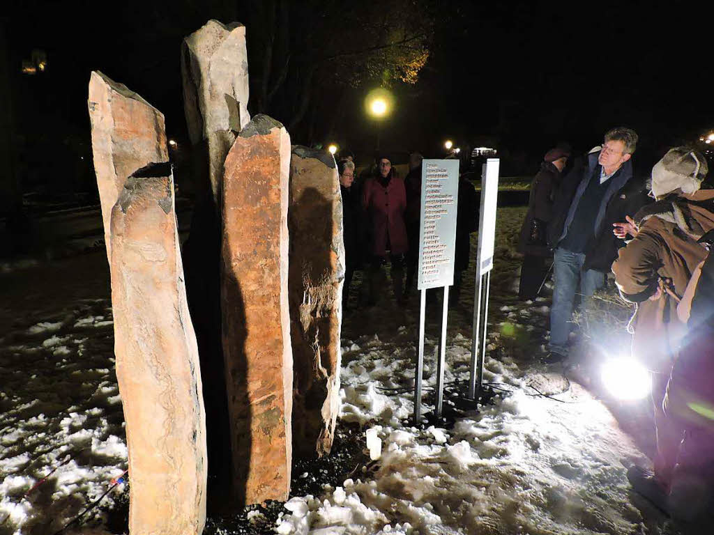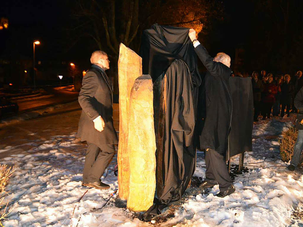 The five basalt columns, representing the fifth commandment “Thou shalt not kill,” and two information plaques were unveiled by mayor Roman Götzmann and historian Wolfram Wette.