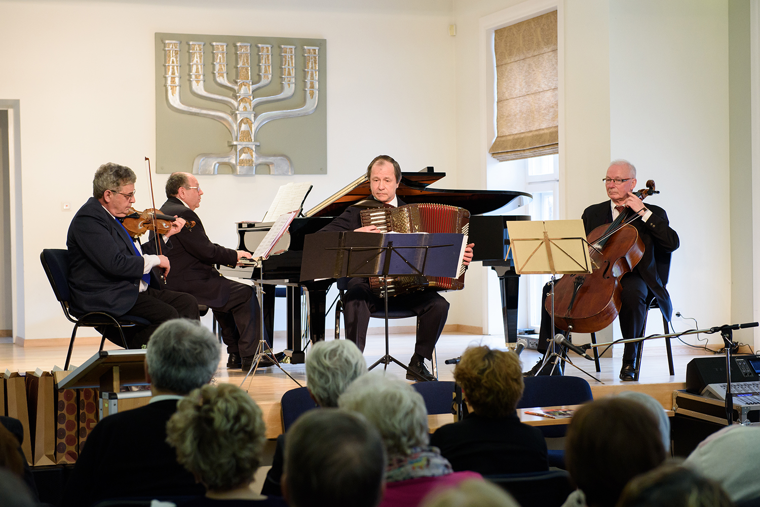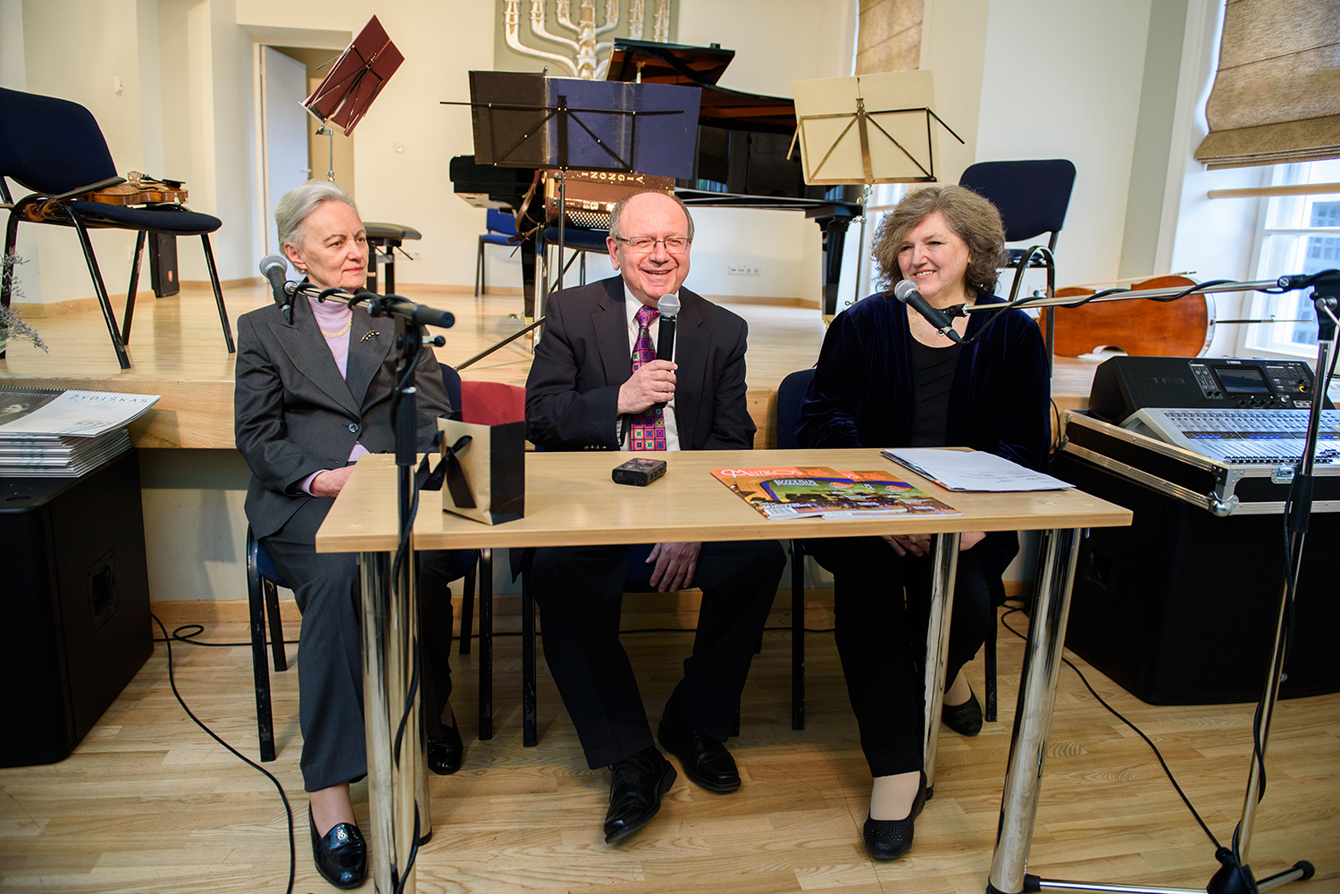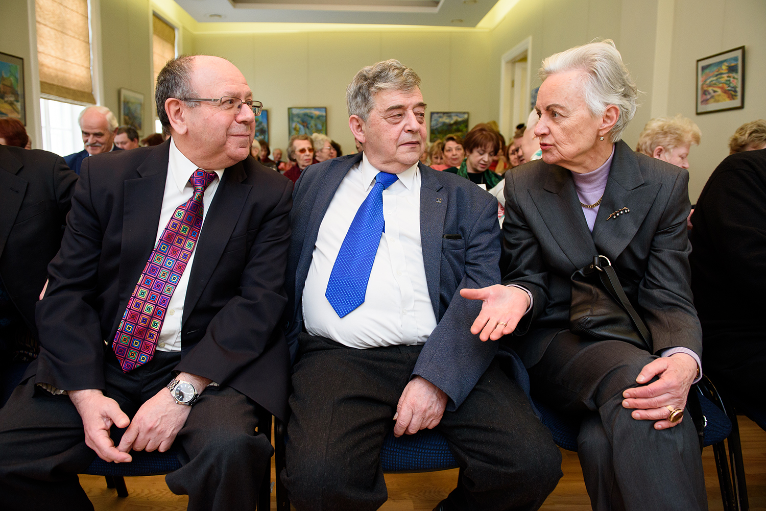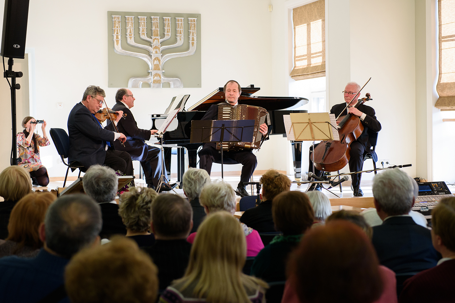 The birthday celebration was part of the Destinies program of evening cultural events initiated and organized by LJC deputy chairwoman Maša Grodnikienė, who used the occasion to honor the memory of Melnikas’s father Isaiah Melnik, who would have turned 110 that same day. He was a well-known pharmacist at the Vilnius Central Pharmacy (on what is now Gedimino prospect) and at the Žvėrynas Pharmacy in Vilnius, where he made his own preparations in his time. He survived both Stutthof and Dachau. He was beloved by all and was a calm and warm person who enjoyed attending all sorts of concerts. His son Leonidas’s musical career began when his mother took him to the Ąžuoliukas school. His first teacher was the famous pianist Nadežda Duksdulskaitė. “My entire childhood was illuminated by my parents, the very best, the very wisest people, and family remains extremely important to me,” Melnikas said of himself before embarking on a performance of tango melodies with violinist Boris Traub, cellist Valentinas Kaplūnas and accordion player Gennady Savkov.