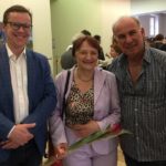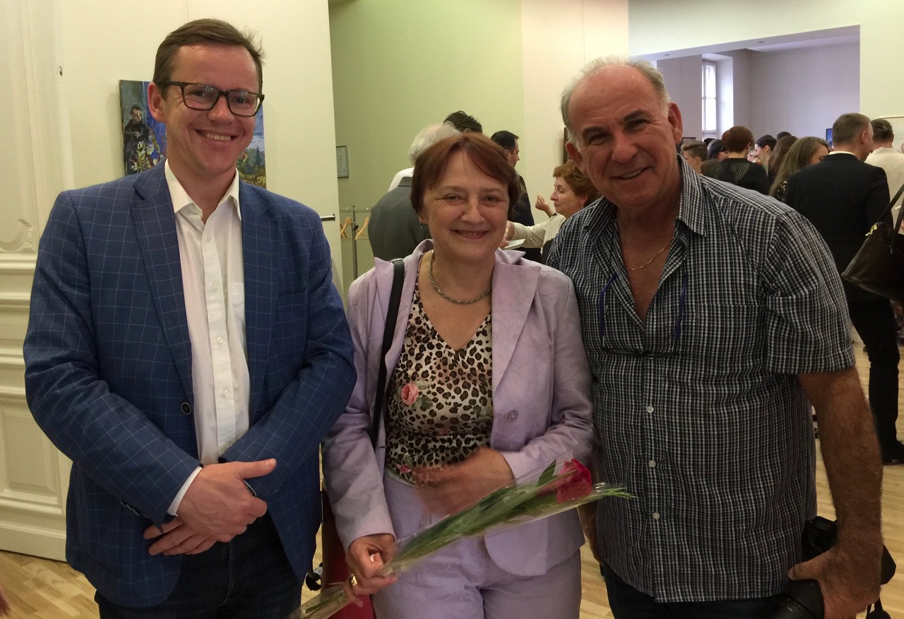 The party then moved to the third floor of the Lithuanian Jewish Community where the children or young adults had a candle-lighting ceremony to honor their parents, school, homeland, Israel and fallen Israeli soldiers. The festivities here were in Lithuanian and Hebrew. Israeli ambassador Amir Maimon spoke in a very genuine manner, translated to Lithuanian by Sholem Aleichem Hebrew teacher Ruth Reches, and recounted the parable of rabbi asked to repeat the whole of the law while standing on one foot. The young people performed songs, dance and did short skits in Lithuanian based on the writings of the author Sholem Aleichem and other Yiddish writers. After the young people were presented token gifts from the Lithuanian Jewish Community, the party moved into the foyer where there was abundant snacks, juice, coffee, wine and water. A series of artworks by students made especially for the occasion lined a long table as people helped themselves to hors d’oeuvres and waiters and waitresses circulated through the crowd with plates laden with food.