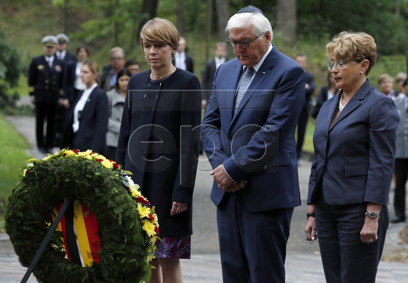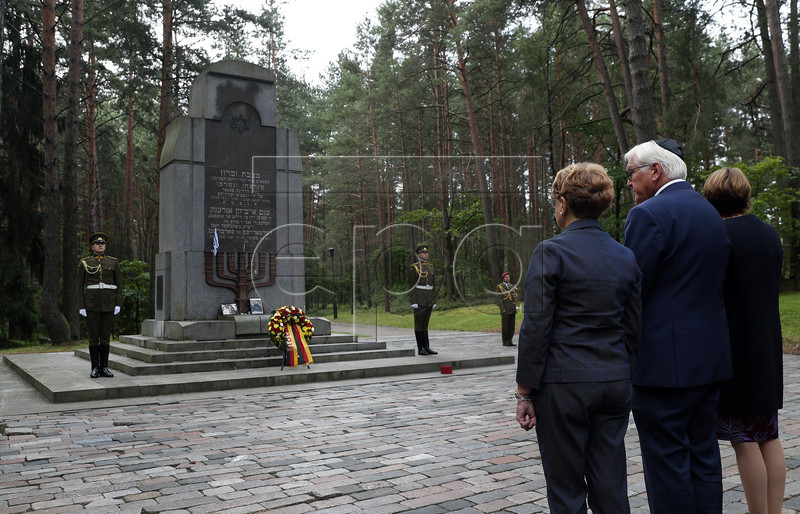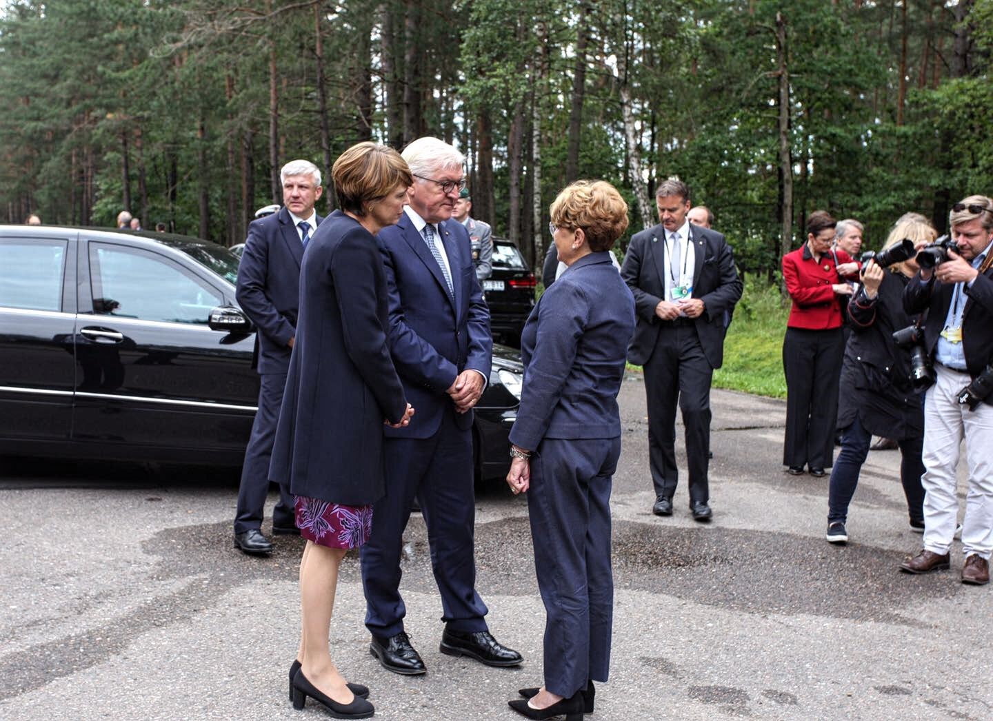 German president Frank-Walter Steinmeier, his wife Elke Buedenbender and chairwoman of the Lithuanian Jewish Community Faina Kukliansky participated in a wreath-laying ceremony at the Ponari Holocaust memorial in Vilnius, Lithuania, on August 25, 2017. Steinmeier is on an official four-day tour visiting the Baltic countries Estonia, Latvia and Lithuania to strengthen diplomatic relations with Germany. The Baltic region is an important ally in the North Atlantic Treaty Organization (NATO).