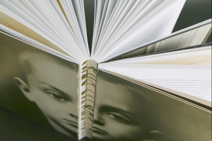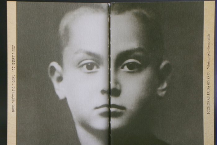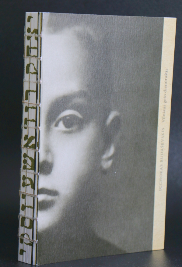 Now the Lithuanian Jewish Community with financial aid from the Goodwill Foundation and the Lithuanian Cultural Council has published a Lithuanian translation of the material Sutzkever published earlier. The book has an “artsy” cover with an open spine, so the muscilage and binding threads are visible, stamped with an off-black ink inscription in Yiddish of Ytizhak Rudashevski’s name. One half of the book is right-to-left Yiddish, the other half left-to-right Lithuanian. The cover is half of Rudashevski’s face; when opened, the coverless spine disappears and both halves of the face come together.