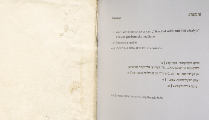 The book contains a long introduction by the translator, Mindaugas Kvietkauskas, and a short note from Lithuanian Jewish Community chairwoman Faina Kukliansky haling its appearance. The paper is thick, “Munken Lynx 120 gr.” for the body text and 280 grade for the four cover pages (the face front and back covers are followed by what amounts to title page in Yiddish and Lithuanian written vertically from bottom to top).