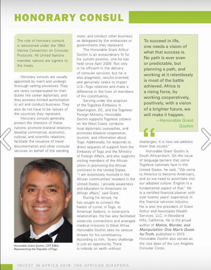 Grant Gochin is a member in good standing of the Lithuanian Jewish Community. Originally from South Africa, he’s worked as a wealth and financial planner in the United States for decades. A dual citizen of Lithuania and the United States, he also operates the consulate of Togo in California, as well as performing important duties for the African Union. The following was published in the AU magazine Invest in Africa in the June, 2018, edition.