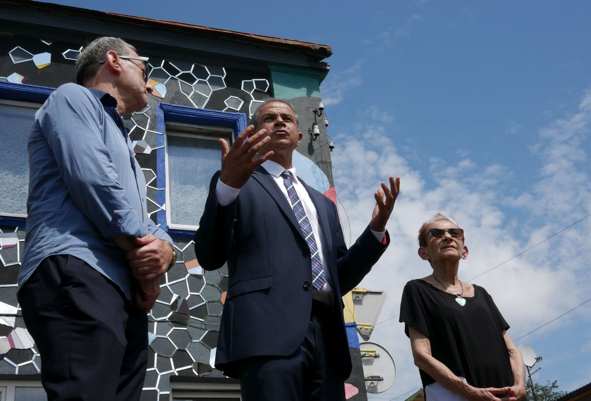 “About 40,000 Jews lived in this neighborhood, men, women and children. Each was assigned a living space less than three meters square. The territory was surrounded by barbed wire. Day and night the people here lived in tremendous fear they would be taken to be killed… But, despite everything, life went on here. Although it was forbidden, children were born and the people kept the Sabbath important to the Jewish nation. We should also remember what was good, but we cannot forget the pain and hardships people went through. Today, the Jewish people will live through the bright colors of this house,” Israeli ambassador Amir Maimon said enthusiastically standing next to the large outdoor art project.