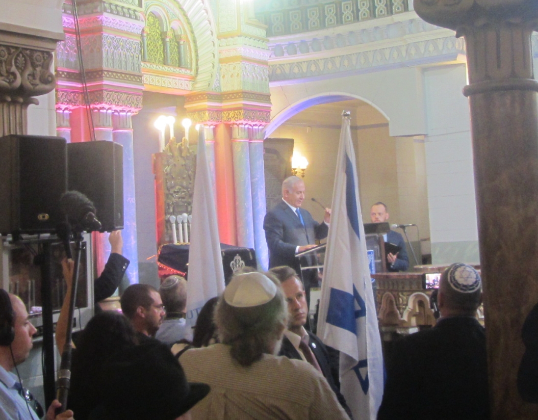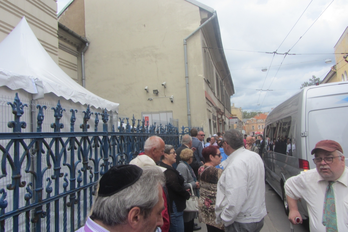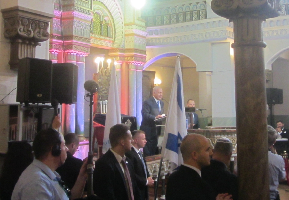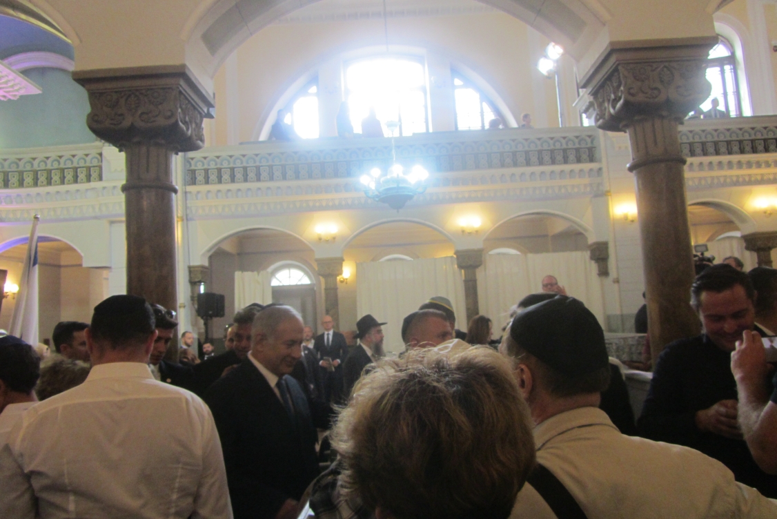 A long queue of Lithuanian Jews and friends of Israel eager to hear Israeli PM Binyamin Netanyahu crowded the sidewalk outside the Choral Synagogue in Vilnius Sunday. Scheduled to start at 11:00 A.M., Netanyahu arrived about an hour and a half late, which only seemed to increase the audience’s anticipation, with applause when he and his wife entered. The main hall and the balcony were full to capacity as Israeli and Lithuanian security scanned the crowd during the first visit ever by an Israeli prime minister to Lithuania.