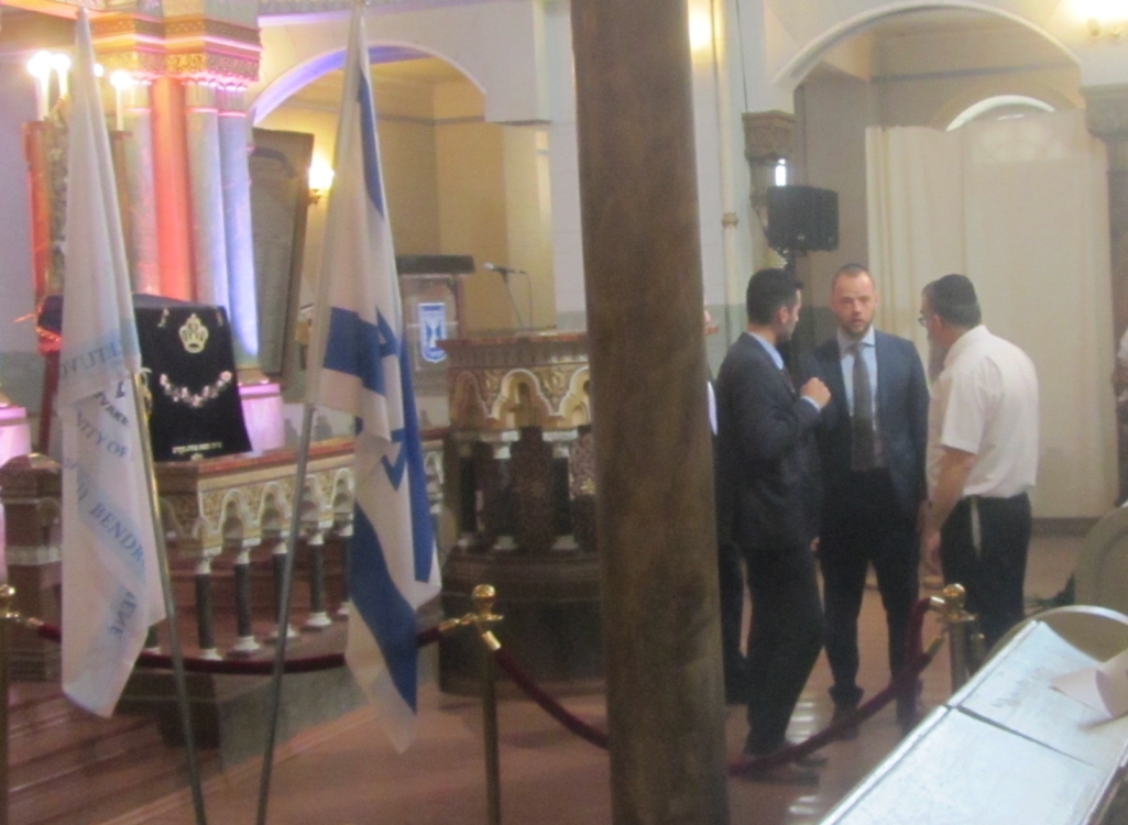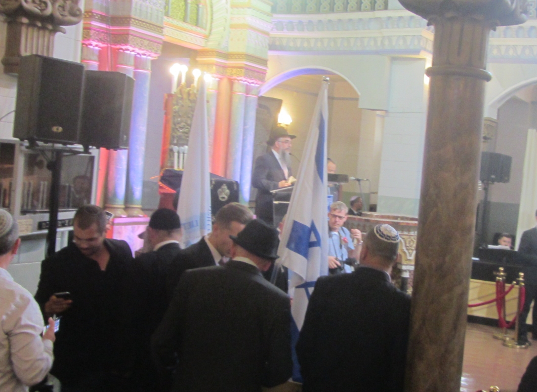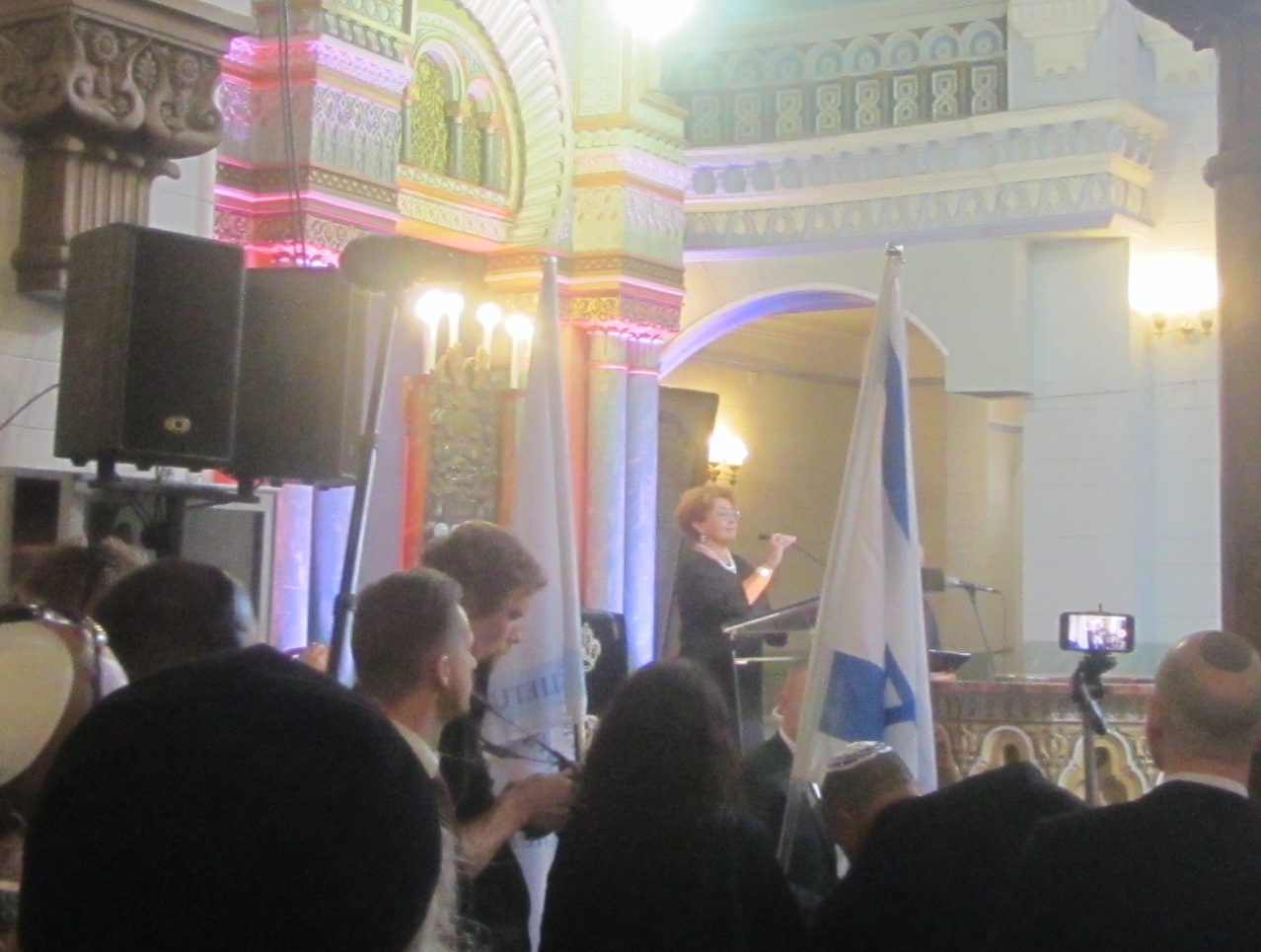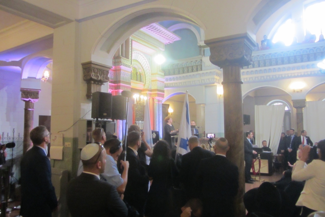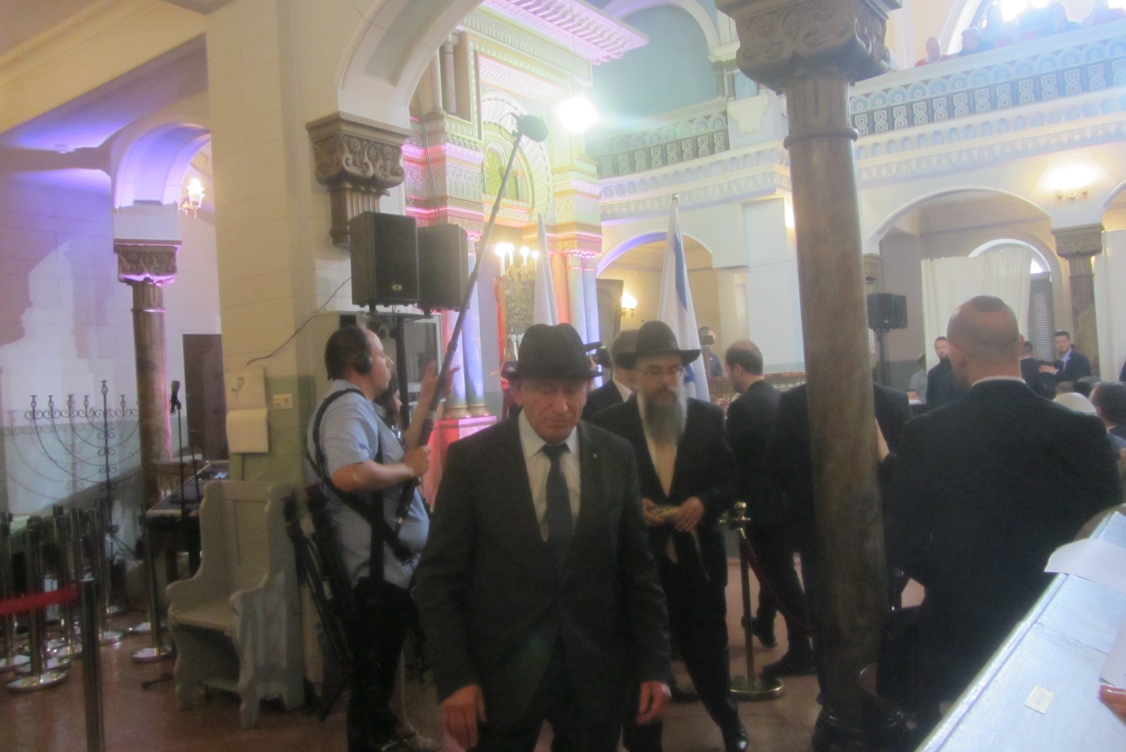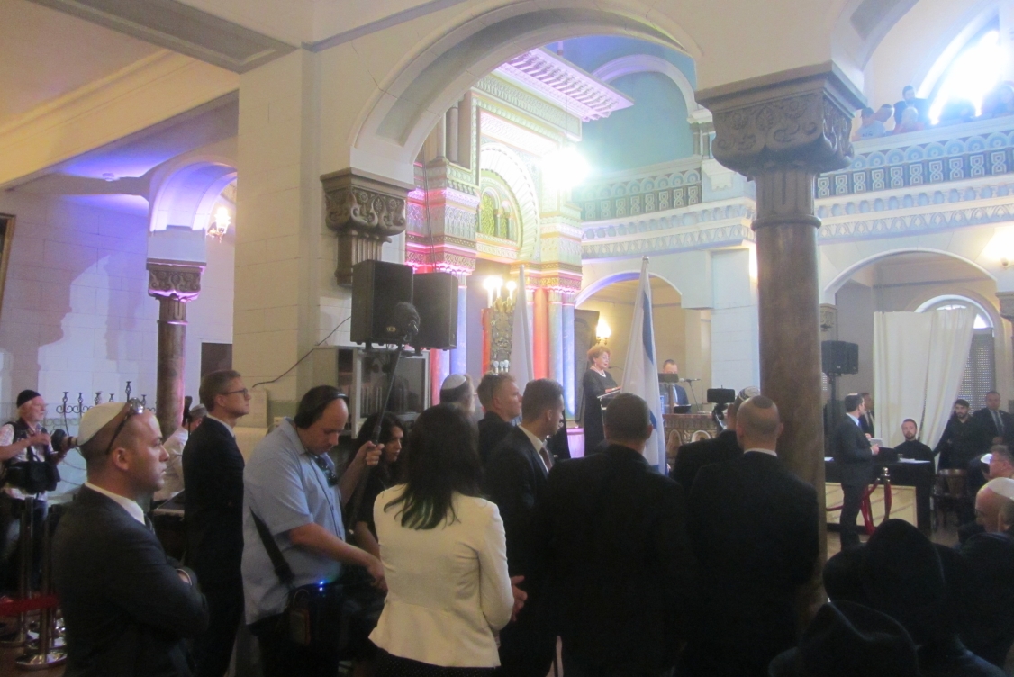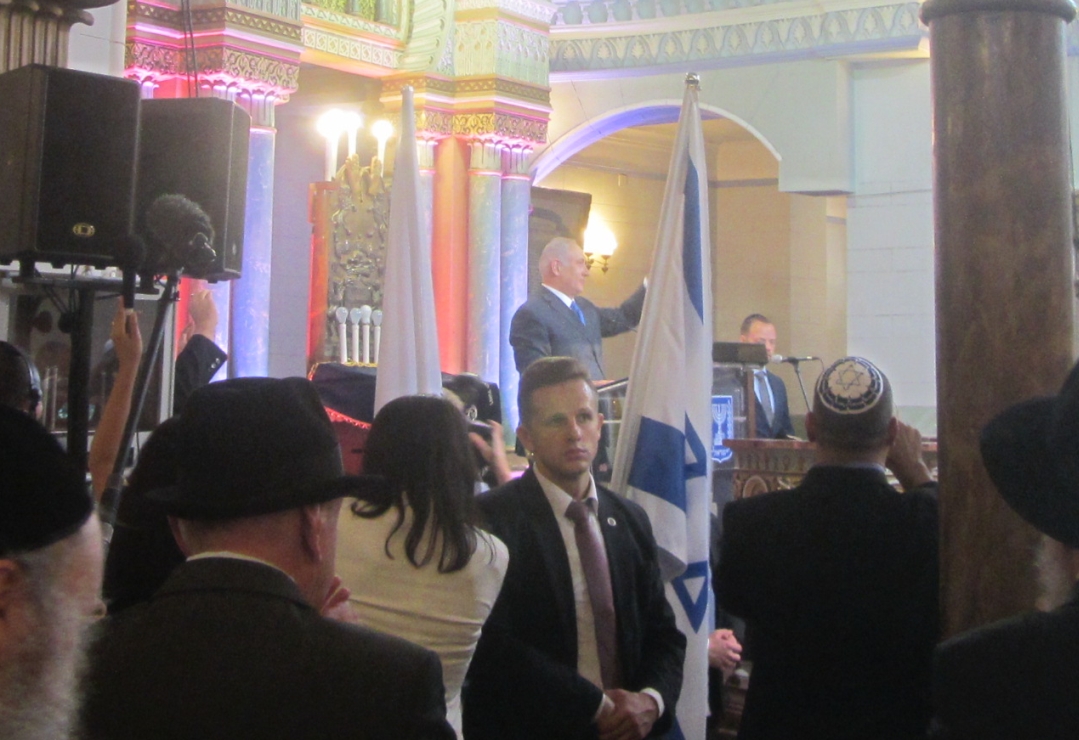 Rafaelas Karpis performed the Partisan Hymn in Yiddish and several other songs, after which Choral Synagogue cantor Shmuel Yaatov sang a biblical passage about the loss of Israel. Rabbi Ber Krinsky thanked the prime minister for coming and expressed special support for Israel, for the prime minister and for his family. The event ended with the Israeli national anthem.