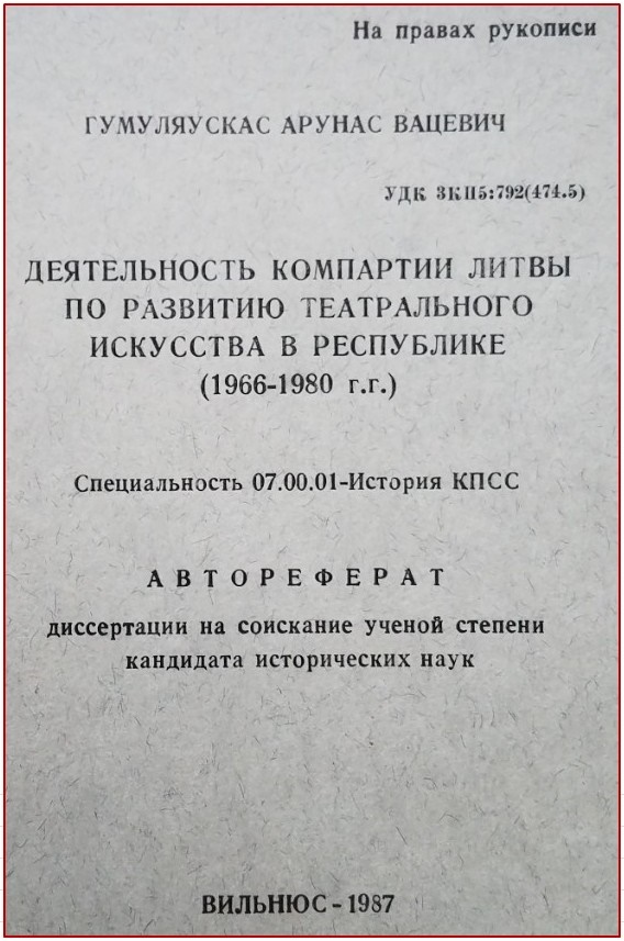“Graduated from Vilnius University in 1981. [worked three years according to assignment]. Post-graduate work at the same university from 1984 to 1987. Defended doctoral candidate dissertation ‘Activity of the Lithuanian Communist Party in the Development of the Art of Theater in the Republic (1966-1980),’ [became] doctor of the liberal arts.”