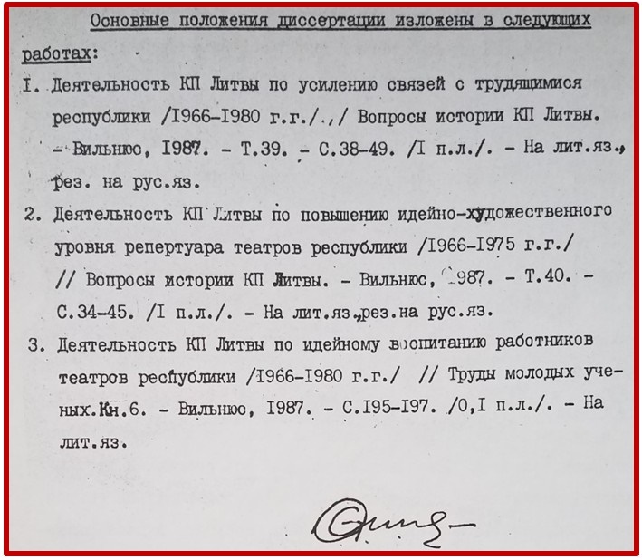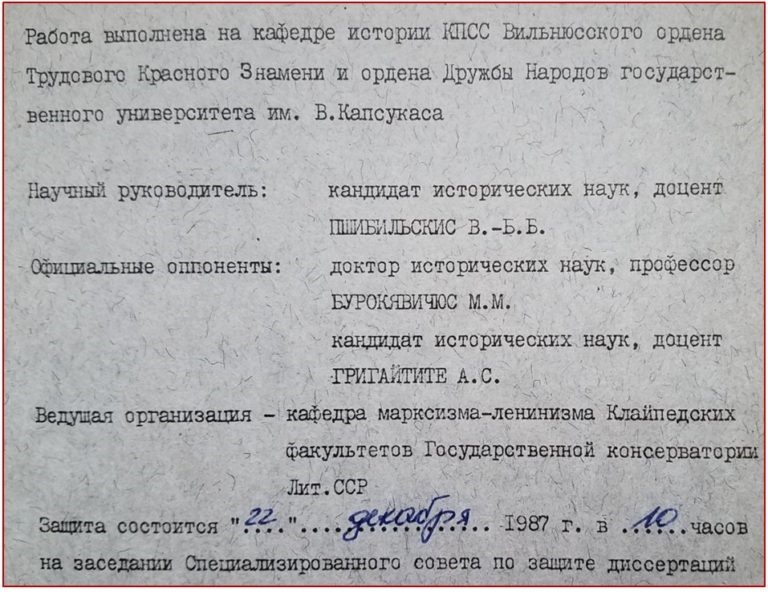 Work performed at the cathedral [faculty] of the History of the Communist Party of the Soviet Union at Vilnius University.