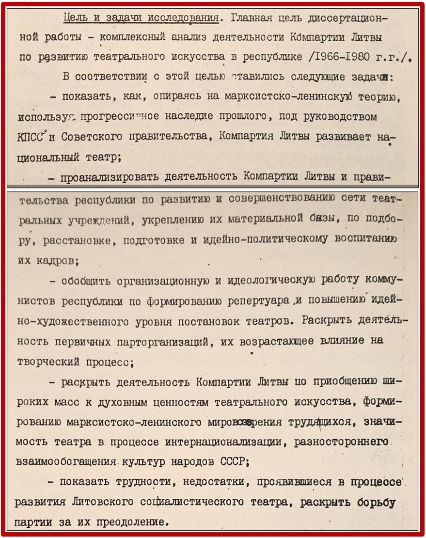-to demonstrate how, based on Marxist-Leninist theory, employing the progressive inheritance of the past under the leadership of the Communist Party of the Soviet Union and the Soviet Government, the Lithuanian Communist Party is creating a national theater.