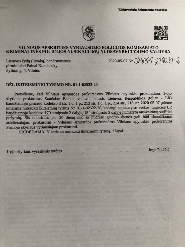 She added this decision by the prosecutor would be reported to a special working group set up by the Lithuanian interior minister for countering hate crimes and hate speech in Lithuania. Kukliansky is a member of this working group.