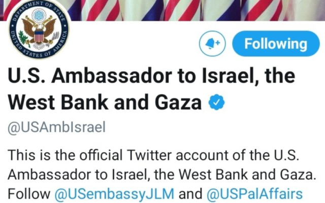 A short time later it reverted to “US Ambassador to Israel” and a spokesman for the embassy told The Times of Israel that the changes “did not reflect a policy change or indication of future policy change.”