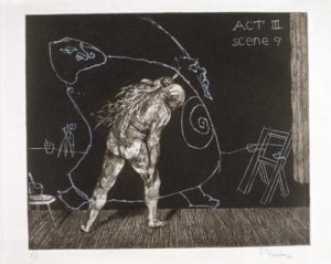 From 1975 to 1981 he had acted and directed in the Junction Avenue Theatre Company in Joburg. In the 1980s he was an art director for telefilms and tv series. Before that till the mid-70s was making prints and drawings. In 1979 he created from 20 to 30 linotypes which soon became known as the Pit Series. In 1980 he executed about 50 small-format etchings which he called the “Domestic Scenes.” These two extraordinary groups of prints served to establish Kentridge’s artistic identity, an identity he continued to develop in various media. Despite his ongoing exploration of non-traditional media, the foundation of his art has always been drawing and printmaking.