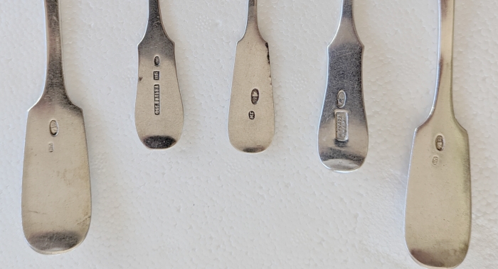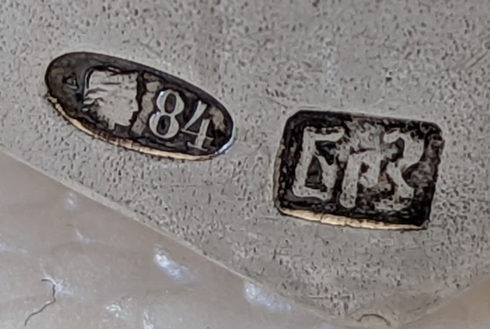 The silver purity code is 84. They also seem to have letters БРЗ (BRZ) or the first two of these letters and the number 3. This is probably the personal stamp of the manufacturer or expert who assessed the purity of the material [or perhaps simply an abbreviation of Biržai–editor]. (Thanks to Grisha Alpernas).