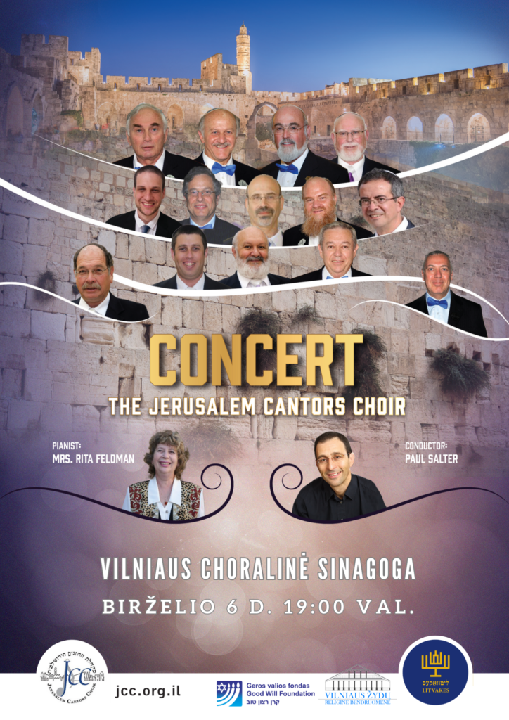 The Lithuanian Jewish Community and the Vilnius Jewish Religious Community invite you to a concert performance by the Jerusalem Cantors Choir at the Choral Synagogue in Vilnius at 7:00 P.M. on Tuesday, June 6, with Paul Salter conducting and Rita Feldman on piano.