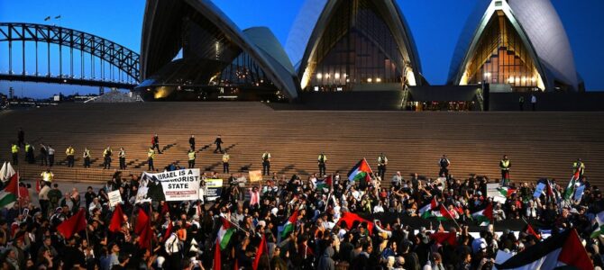 Australians consider the Sydney Opera House the quintessential image of Australia around the world. Police detained at least one person at the October 9 gathering for waving an Israeli flag.