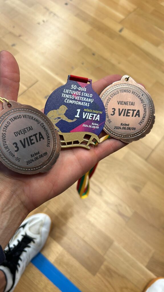 Playing singles and doubles in the 45-49 age group with partner Jurgita Grucytė from the Sostinė club, Rafaelis competed against the strong team of Aidas Čeponka and Anželika Petrauskienė who have won before. After pitched battle, in the fourth set Rafaelis and Jurgita only needed one more point to win, and concentrated sufficiently to get that point, winning 3:2 and taking gold.