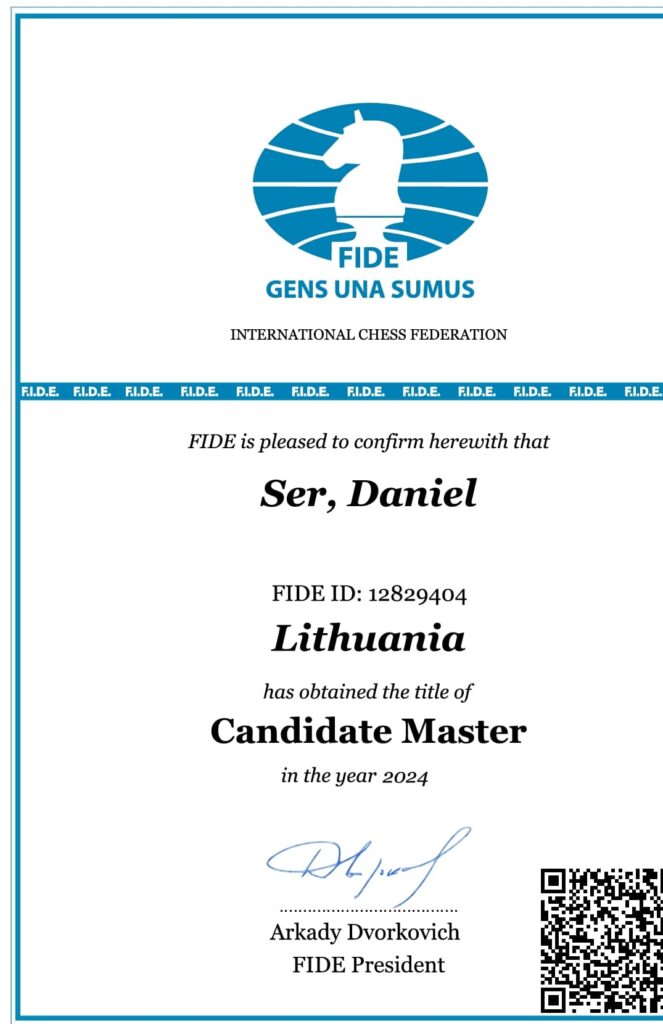 Heartfelt congratulations go to our young chess champion Daniel Ser from Šiauliai competing as part of the Lithuanian Makabi Athletics Club. He took silver in the European Union chess championship and met the rating requirements for FIDE to bestow the title of candidate chess master upon him and is now the youngest candidate for master in the three Baltic states. We are very proud of Daniel and his parents and wish him every continued success.