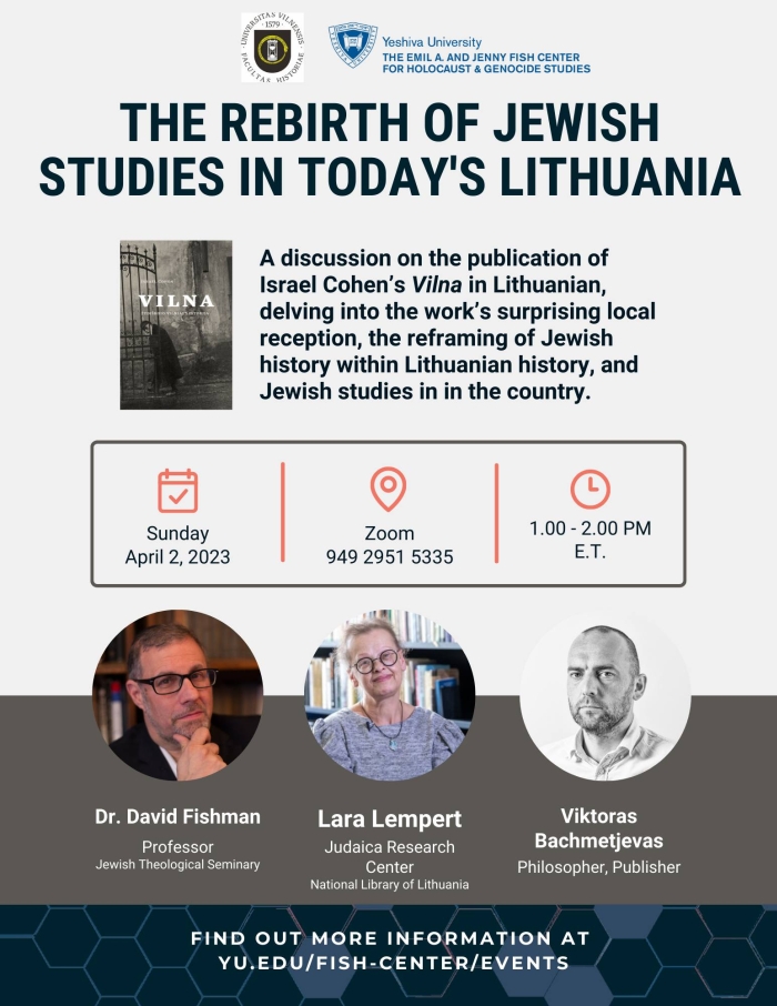 Called “Yiddish Literature in Interwar Lithuania,” the author discusses the evacuation of Jews from the borderlands in Tsarist Russia during the First World War and the lasting effects that had on Jewish identity. She characterizes Lithuanian Yiddish literature in the 1920s as showcasing separation, alienation and solitude. In the 1930s, she says, a new Jewish identity began to coalesce, tied organically to the culture and society of the Republic of Lithuania. Her presentation will include passages from Yiddish writers, literary clubs and publications from 1918 to 1940