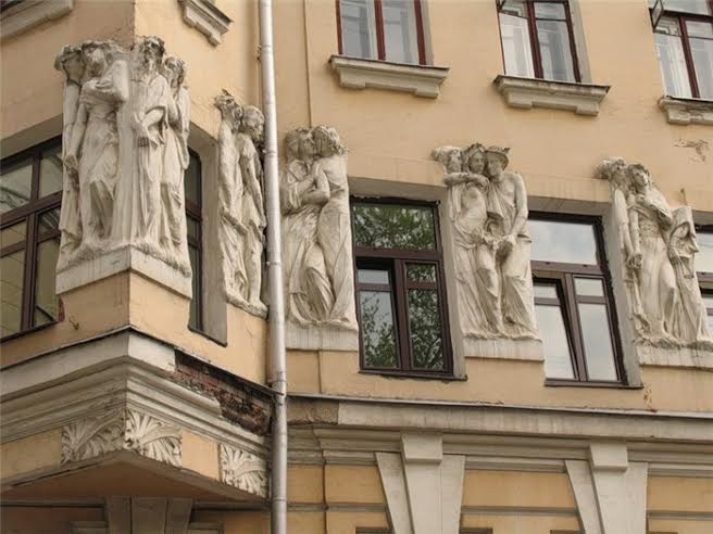 (Скульптуры на фасаде здания по Плотниковому пер., 4. Автор фотографии неизвестен)
